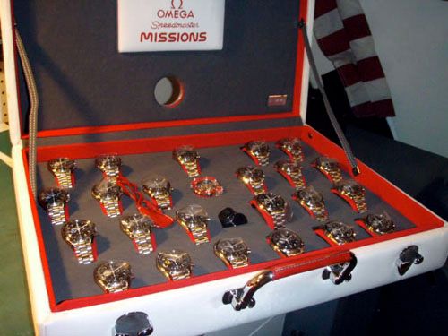This week’s MotoringExposure article on watches is about Omega’s Speedmaster Missions case. There is one (#34) up for sale on eBay for $145,000.- USD and as this is a very rare occasion, I thought it might be well worth blogging about. Of the 50 cases produced in total (in three batches of 40 and another 5 in 1997 and yet another 5 in 1998), this Missions case belongs to the first batch. These cases consist of 22 Speedmaster Mission models (with NASA mission patch at 9 o’clock) and 1 Speedmaster Replica to honor the first Speedmaster CK2915 of 1957. So, in total, $145K USD will bring you 23 timepieces, a loupe, a spare caliber 1861 movement and a nice case.