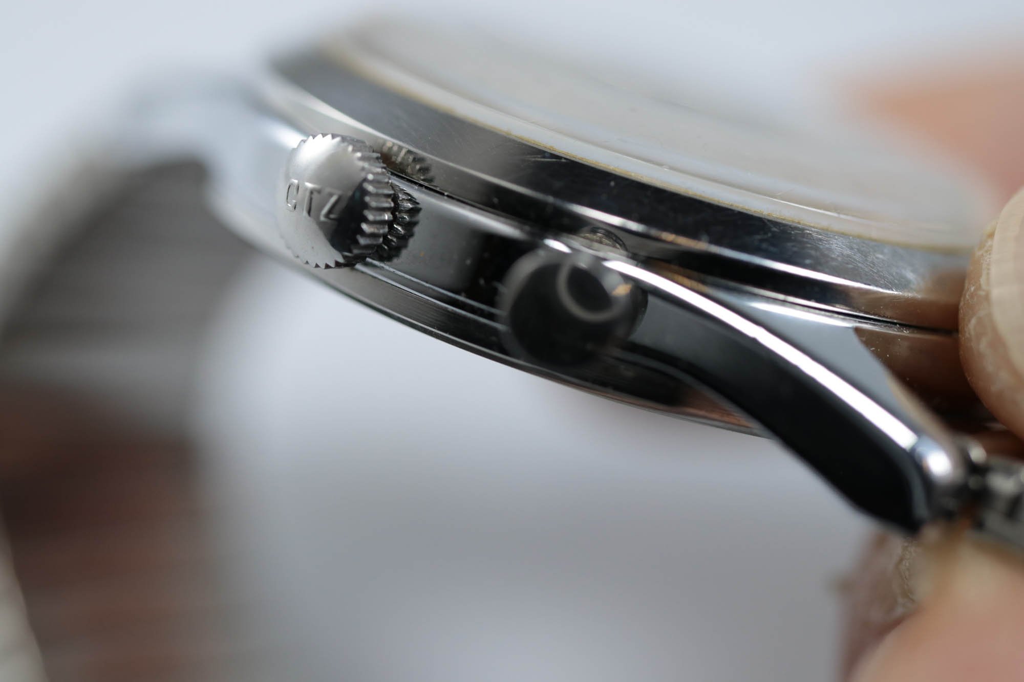 There were two major Citizen Shine executions. I like the applied round hour indexes on earlier versions, but the shape of the watch case is not my cup of tea. Or let’s say I prefer the latter case shape more. I prefer the dial in the first Citizen Shine series, but again can’t say the same about the frontal crystal lid. An early version opens manually by lifting it at 6. Second versions come with a push release button at 2 o’clock. The crystal is hinged to the case at nine and can be opened like a door. Forget the chrono pusher. Pressing a jumping crystal pusher is a one in a million experience.