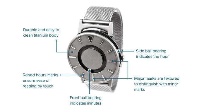 Founders not only promised more durable timepieces for blind people but opened up the topic to other audiences. They marketed it as a timepiece that allows you to not only see what the time it is, but to feel it as well. Imagine being able to check the time in a dark movie theatre without having to illuminate your watch with a smartphone. The quartz movement features a truly innovative side ball bearing indicating hours.