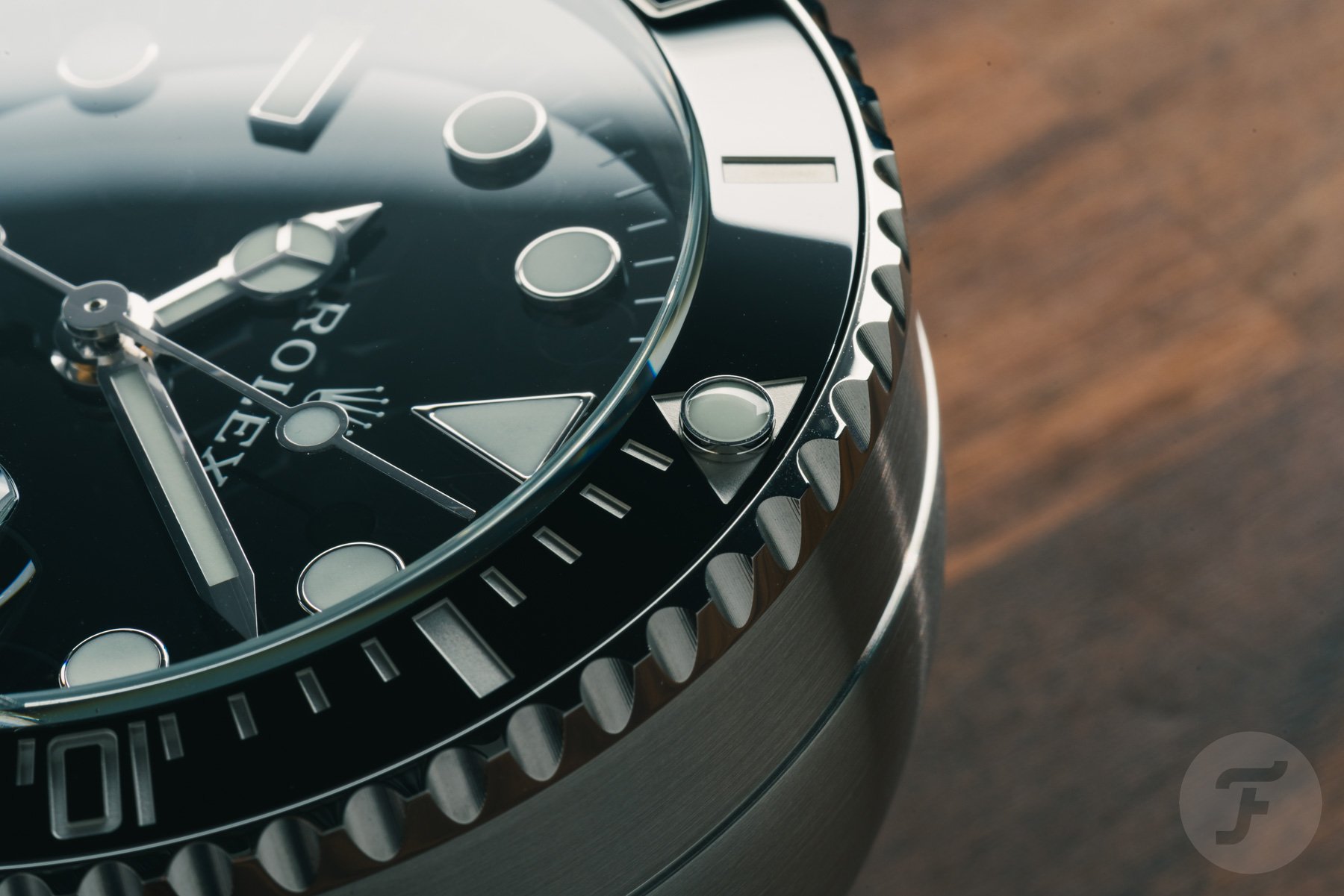 As you can see, the rehaut features the Rolex branding motif, while the Cerachrom bezel insert contains the engraved diving scale in white. To address a question that I’m sure will arise, no, the bezel does not rotate, but I’ll explain why in a bit. Finishing the look in familiar style are the three hands that indicate the hours, minutes, and seconds. What stands out immediately is how well the proportions are maintained, solidifying the idea that you are looking at a giant Rolex Submariner.