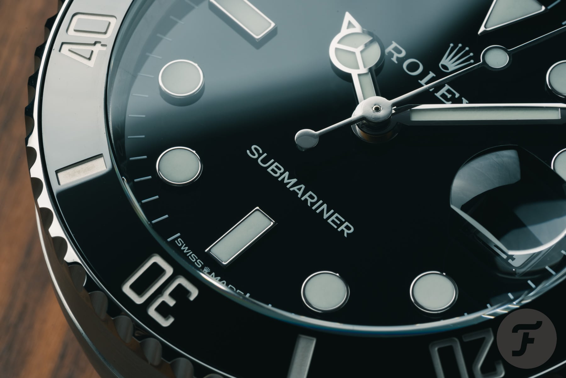 That feeling continues when you realize that the desk clock features a glossy black dial with applied indexes filled with the brand’s proprietary Chromalight luminescent material. Just like on the regular Sub, the material lights up bright blue in the dark, which could be helpful if you plan on working long hours. Additionally, you will see the date window with the brand’s signature Cyclops. You will also notice that there is significantly less text on the dial. The upper part features the Rolex logo and coronet, while the lower half features the Submariner name and the “Swiss Made” text straddling the smaller coronet at 6 o’clock.