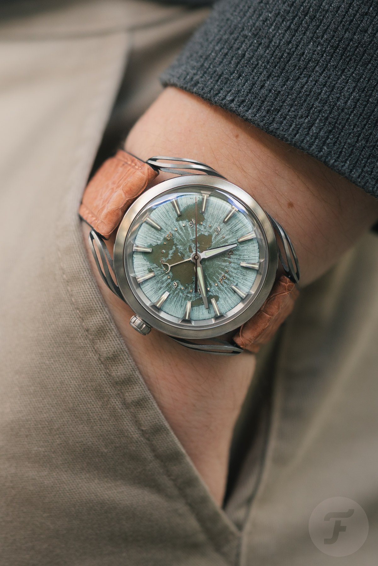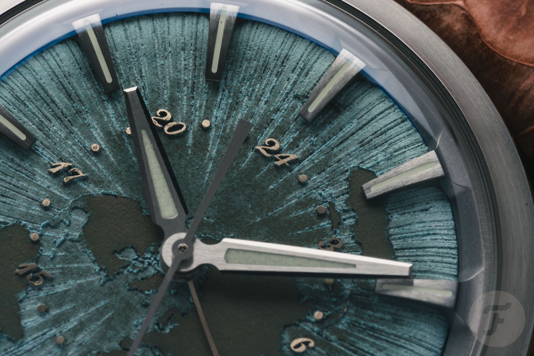 The second model is the Holthinrichs Lab Series 1.GMT. This one has an even more spectacular dial. The base is still a solid domed piece of copper. But on top of a sunburst pattern, it features a map to emphasize that this is a travel watch. The image is an azimuthal projection of Earth viewed from the North Pole. Holthinrichs chose this specific layout because it naturally references the radial division of time zones originating from the Earth’s rotational axis. For this dial, the axis translates into the position of the watch hands. The darker brown tones of the map are created by hand with a microbrush, selectively removing excess patina.