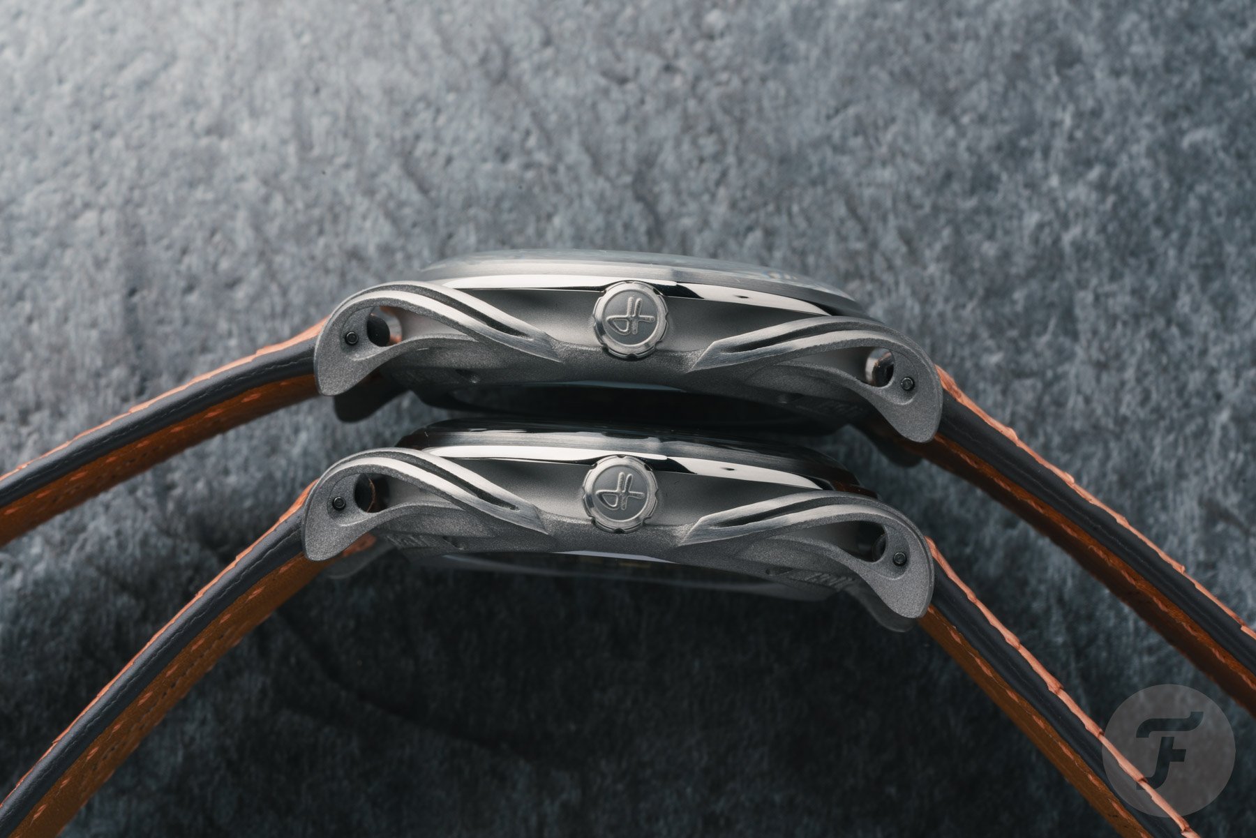 Let’s zoom in on the details. Both watches have the same 3D-printed Grade 5 titanium case, measuring 38.5mm wide, 46mm long, and 9.85mm thick (7.8mm excluding the domed sapphire crystal). Overall, the elegantly flowing case feels slim, and the level of detail and finishing is impressive.