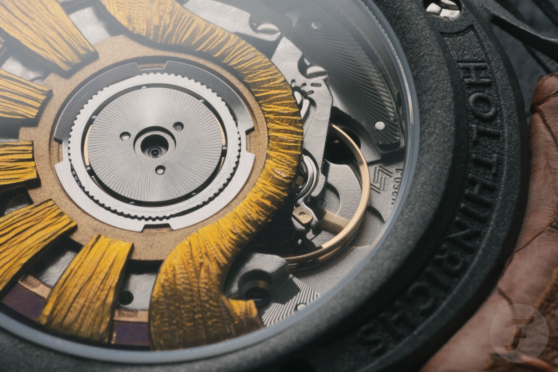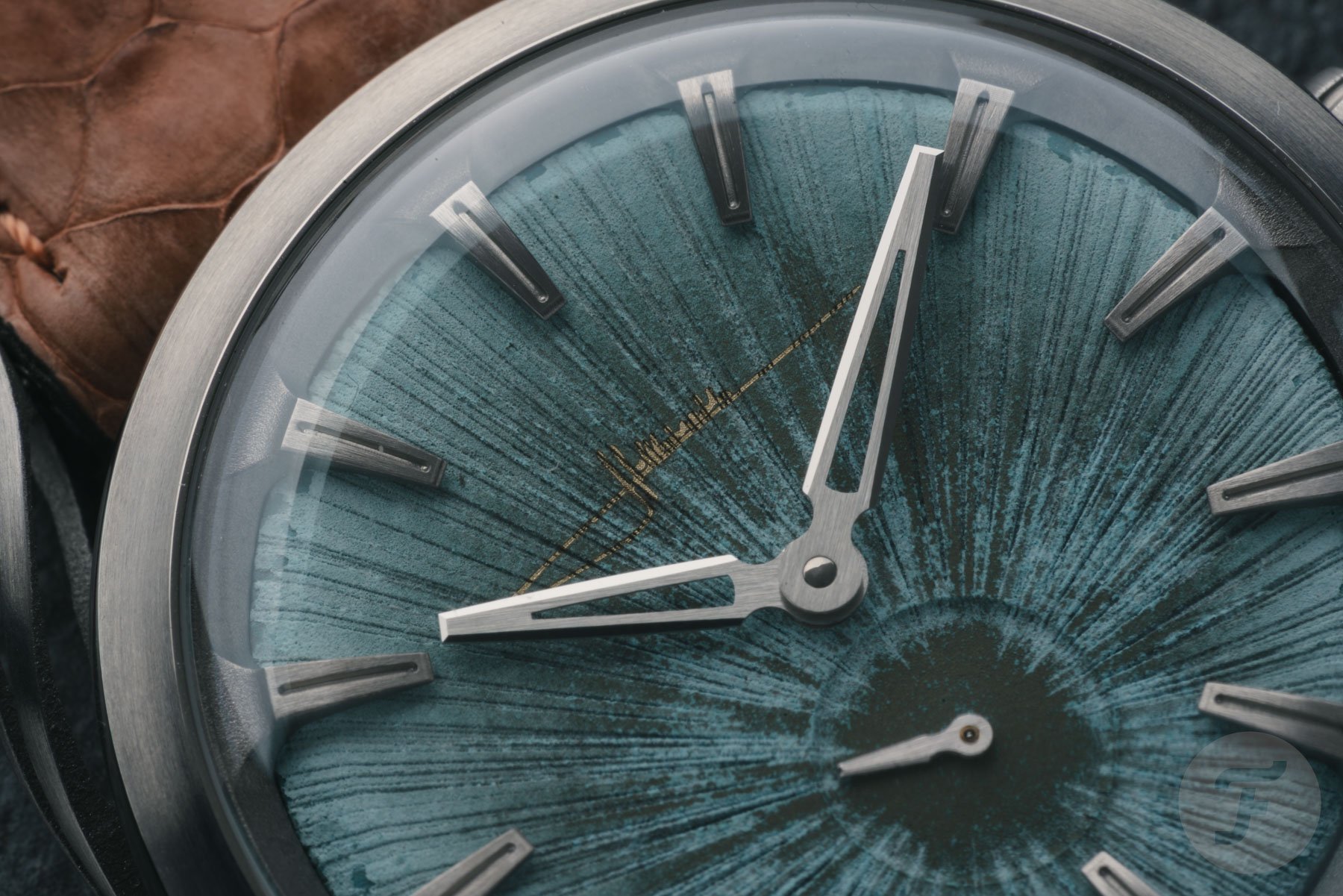 But since they are two distinct models, the details differ as well. The first is the Holthinrichs Lab Series 1.S. This one features a sunburst pattern radiating from the sub-seconds register. As you can see, the sub-dial is predominantly dark green, thanks to the pattern. Furthermore, the brand logo is located at 12 o’clock in a light goldish tone. A detail that I love is the titanium cantilevered hour markers that seem to hover above the dial. The faceted, beautifully finished hands complete the look.