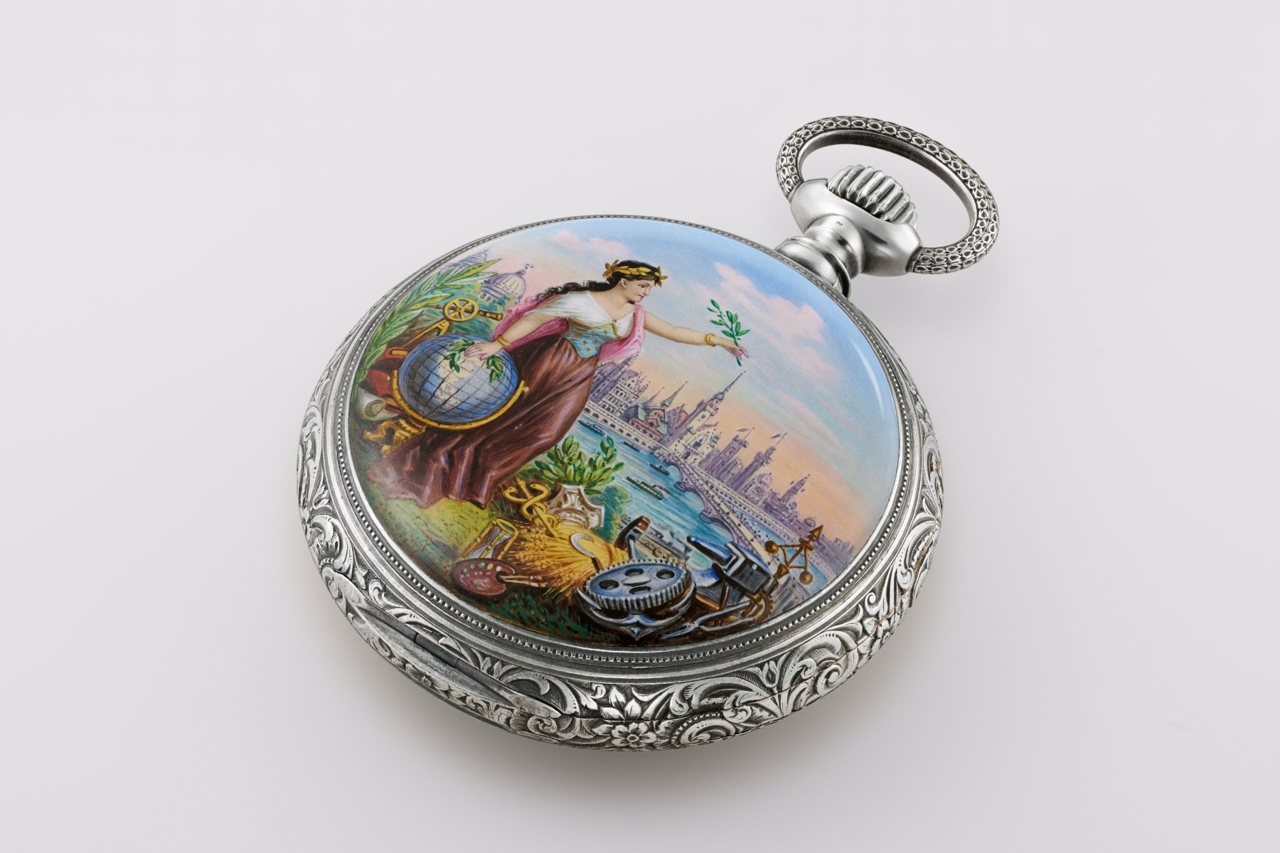 This watch is one of the few tourbillons ever produced by the historic Glashütte manufactory. It features an intricately crafted, platinum-plated gold hunter case adorned with Neo-Renaissance-style engravings. On the front, a polychrome enamel miniature depicts an allegory of Minerva, the Roman goddess of wisdom, standing beside a globe. As the patroness of merchants, craftsmen, and artists, she holds an olive branch in her left hand, symbolizing peace, and a laurel wreath in her right, symbolizing victory. Together, these elements express confidence in the triumph of peace through economic and scientific progress.