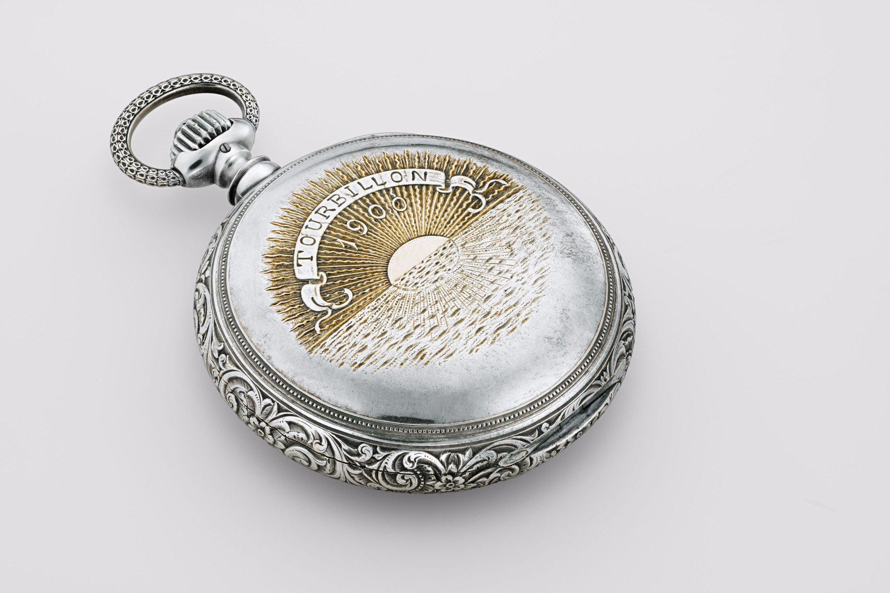 The case back shows a rising sun over the sea, emblematic of the dawn of a new era — the eagerly anticipated 20th century. Because Emil Lange served as a jury member, he could present the watch only outside of the official competition, where it attracted considerable attention from experts.