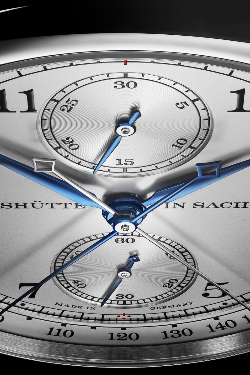 As mentioned, the hands are blued and contrast perfectly with both the black and silver colors used for the dial. Lange uses these blue hands for the central hours and minutes and the central rattrapante hand. The central chronograph hand is executed in rhodium-plated steel to set it apart from the rattrapante hand when using the split-second chronograph mechanism. The small seconds and the 30-minute totalizer hands are also executed in the beautiful blue color that is used for the other hands. As I explained in the article about the “Homage to F. A. Lange”, the vertical layout lets you play with the two central chronograph hands to create a visual symphony of the brilliant handset.