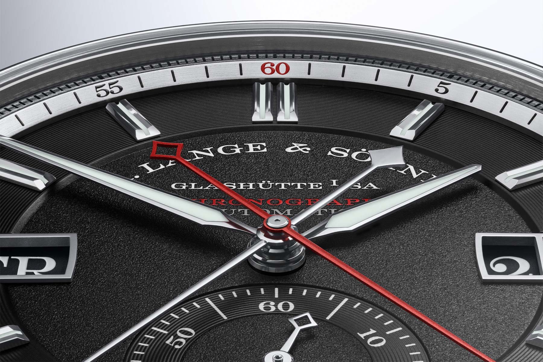 The watch features a central chronograph seconds hand executed in red. So far, nothing new. But as you can see, an additional central hand with a lozenge-shaped tip keeps track of elapsed minutes. It replaces a chronograph minutes counter and keeps the design clean and non-chronograph-like. While a central chronograph minutes hand is not unique to this watch, it’s not something we see often. As a result of this solution, the chronograph can measure up to 60 minutes, while most other chronographs stop at 30 minutes. It shows you how carefully the Lange team considered the watch’s design and technical solutions that fit it.