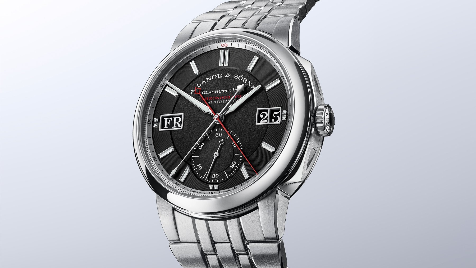 The second technological solution that is quite wonderful and much-needed on top of that is the use of multifunctional pushers. With the crown in the normal position, the pushers at 2 and 4 o’clock operate the chronograph functions. But if you pull the crown out, you can also use the pushers to correct the day and date indicators. With these multifunctional pushers, A. Lange & Söhne was able to keep the design of the new chronograph as close as possible to the regular model, which is a great achievement.