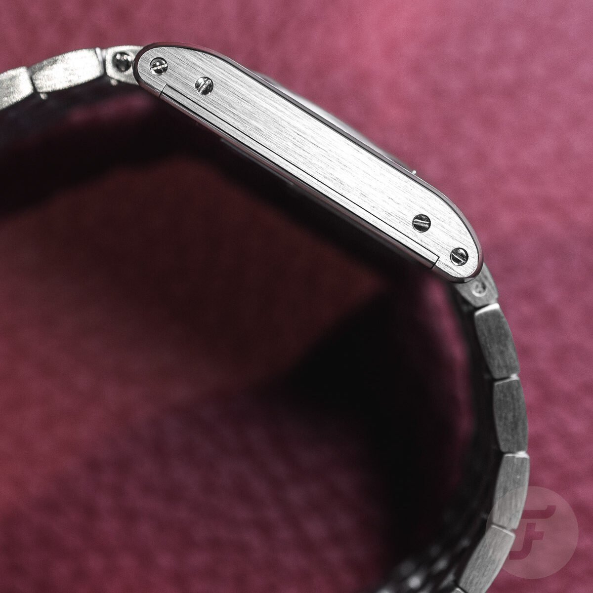 I would’ve appreciated an easier way to switch out the bracelet for a leather strap, though. Right now, there are just two cutouts through which you can reach the spring bar with a tool. But it’s nowhere as nice as the proprietary QuickSwitch system that’s on the current Santos de Cartier, for example. One incredibly nice feature, though, is that the links covering the folding clasp have been milled out to let the clasp’s “arms” lay almost fully flush inside of them. I’ve never seen such an elegant solution before, but I think other brands should certainly follow Cartier’s example here.
