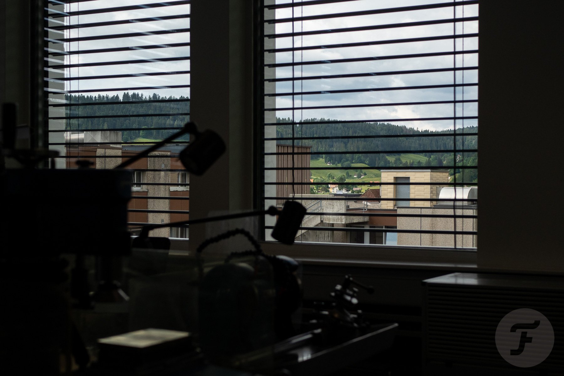 As our visit continued, so did our climb up the main building. We made our way from this machining area at the bottom up to the quality control area. Here, a room full of watchmakers and specialized workers checked the parts produced in all of the adjacent departments. We briefly observed these experts at work through the glass windows lining the hallway, which lead to where stamped parts are produced. Now, when you hear “stamped parts”, you might hear the rattle of a cheap bracelet’s buckle. Believe me when I tell you, however, that even the most prestigious watch brands rely on this process to produce key elements of their movements. Romain guided us into the area where the process takes place — a large room filled with different watchmaking tools and machines, with a wicked view of the nature around Le Locle.