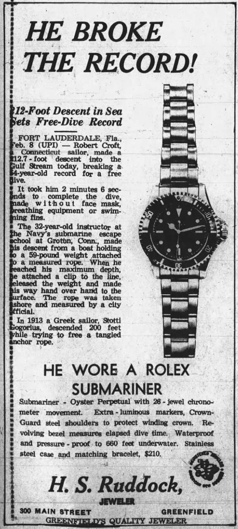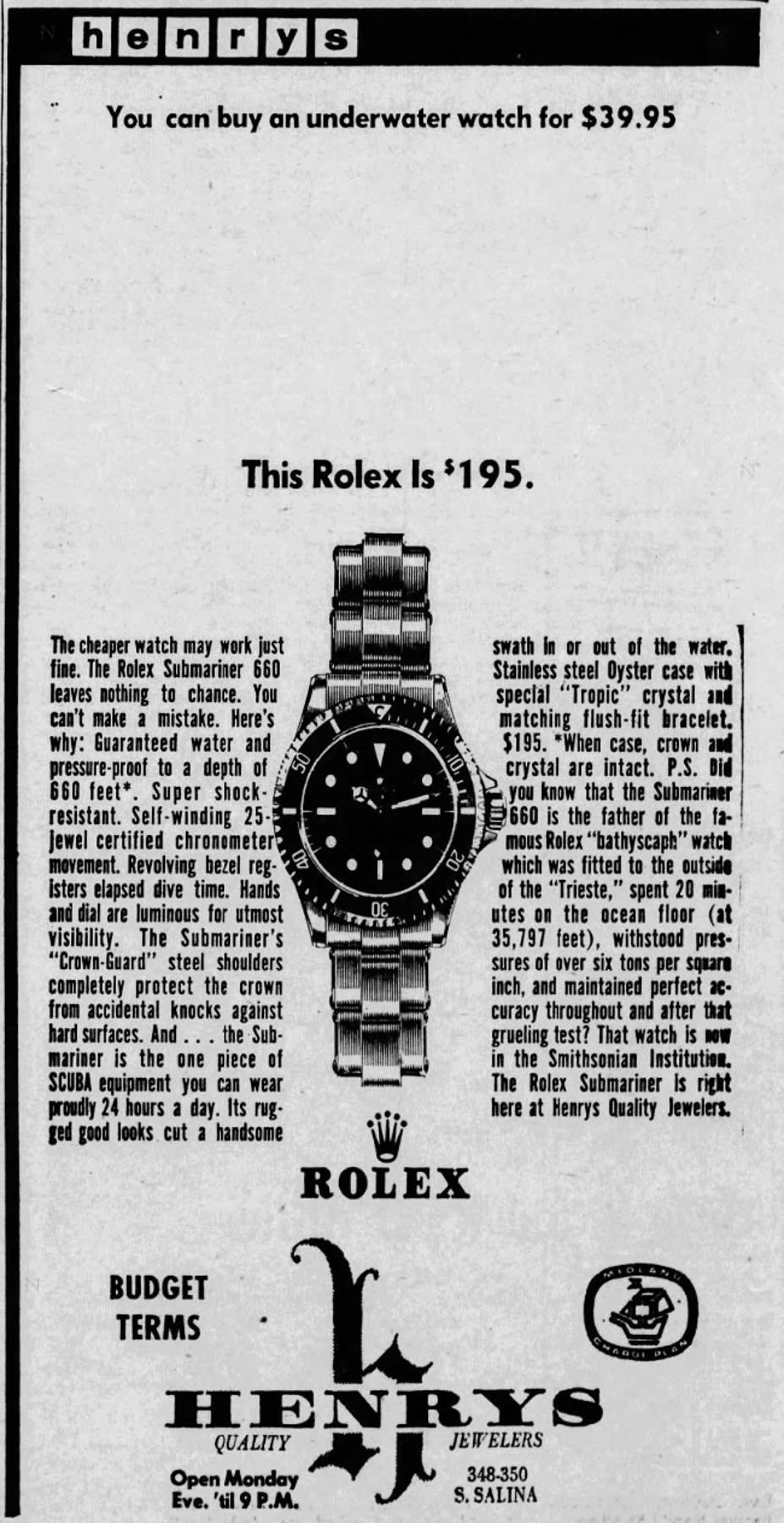 Finally, I find it interesting that these hand-drawn newspaper advertisements often use the same sketches for several years without change. The above advertisement from a Hawaii newspaper still shows a 100m-rated no-crown-guard Submariner in 1965! Of course, this was a different time, and perhaps the store still had a stock of these older products.
