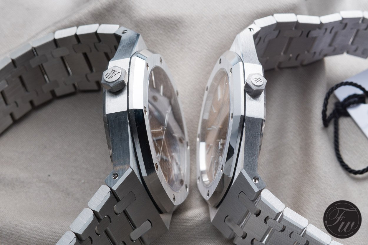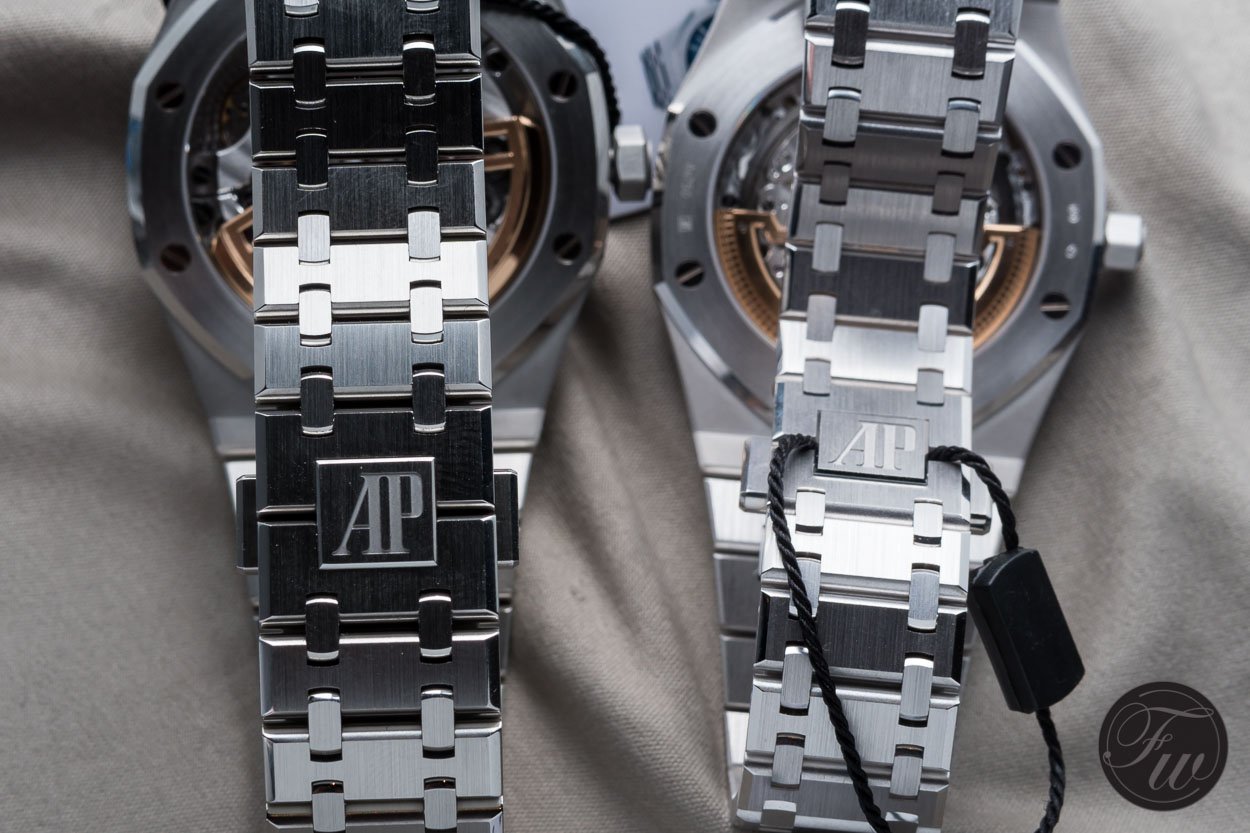 Taking a look at the watches side by side (and for this, we took the new Royal Oak 15500 and the white gold 15202 ), you can clearly see that the case, dial (and its tapisserie pattern), hands, crown, bezel and bolts are substantially larger. The same applies to the beautifully designed and finished Royal Oak bracelets of these two watches.