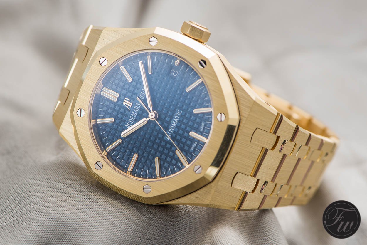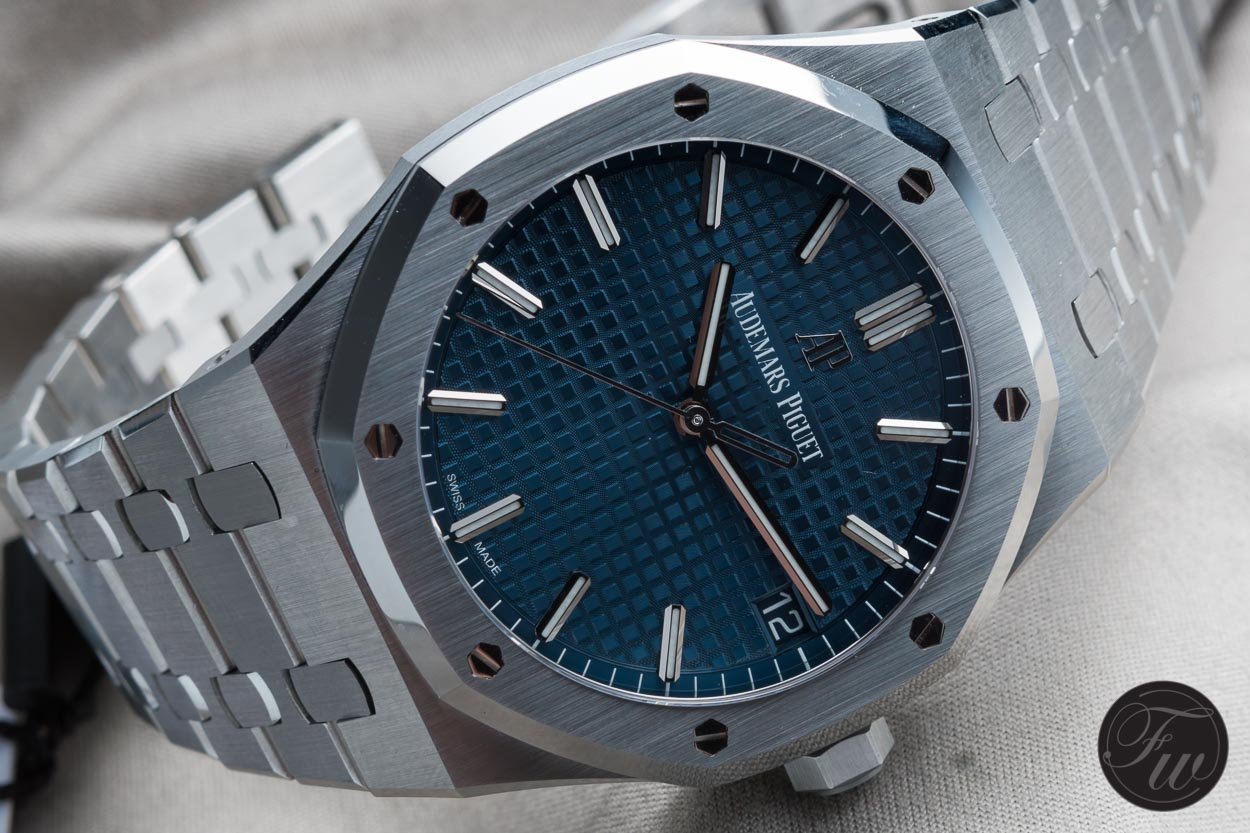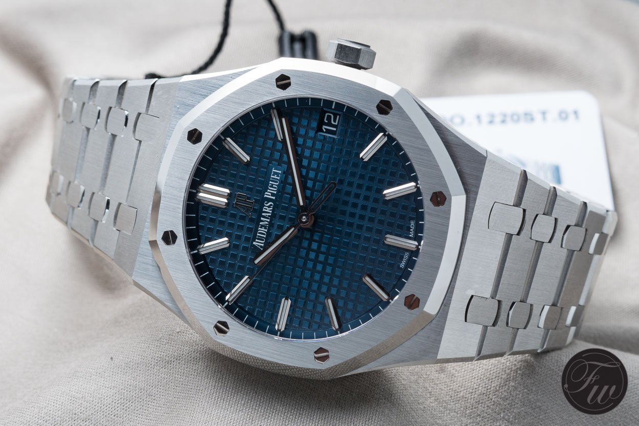 The Royal Oak 15202 comes with a “Petite Tapisserie” blue dial these days (prior to 2012, it was available with a blue, white and charcoal dial), unless you choose for one of the precious metal versions that are available with a gold, salmon (more of pink gold as I wrote above), blue, sunburst blue or even a green dial (The Hour Glass edition).