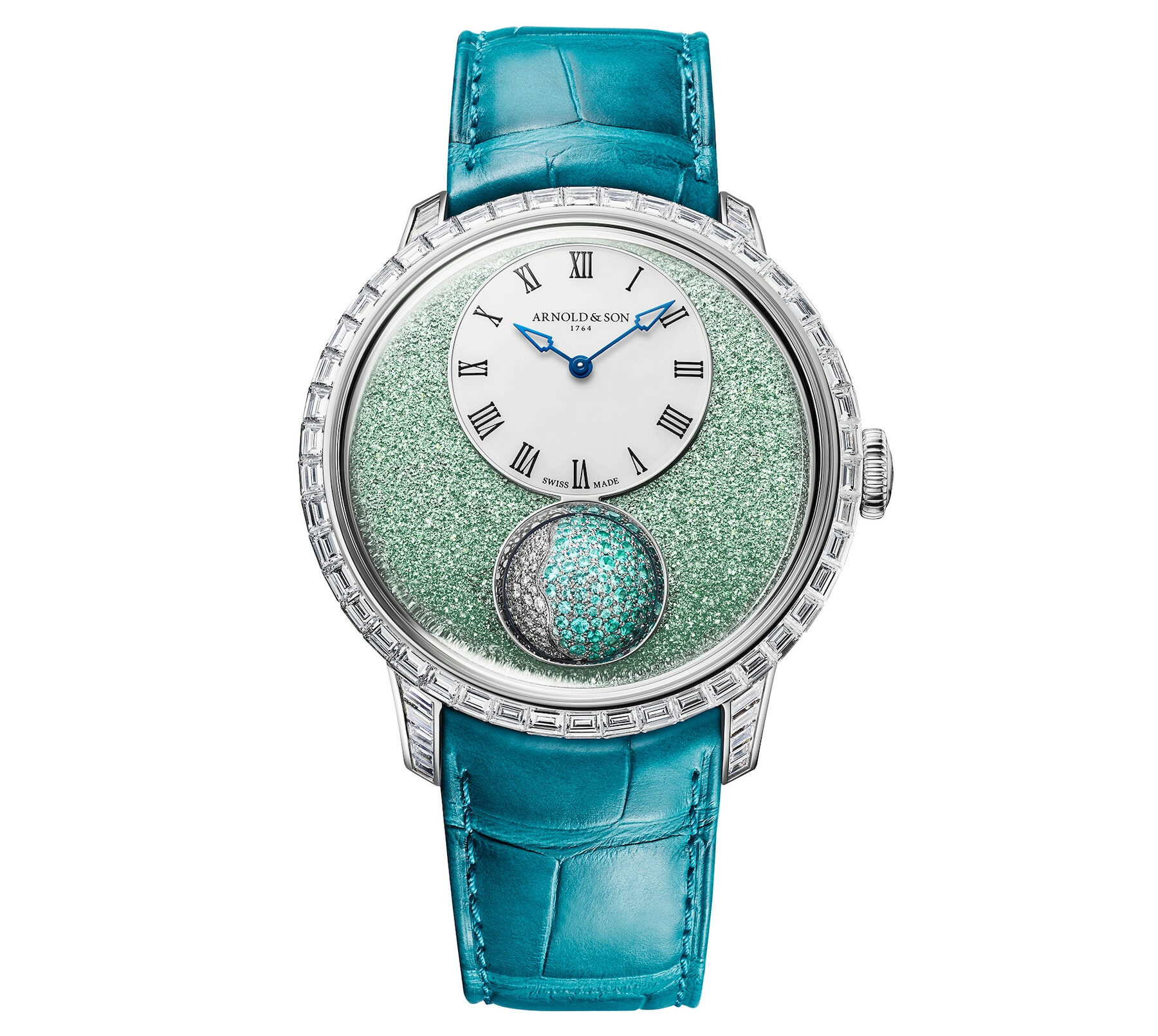 We could say that the people at Arnold & Son are quite obsessed with the moonphase complication. No wonder — their brand name was inspired by John Arnold, an 18th-century watchmaker famous for his marine chronometers. Arnold & Son’s Luna Magna (“Great Moon”) collection pays tribute to the celestial body that was used to navigate the vast seas back then. After last year’s dark blue version, the brand now introduces the Luna Magna Ultimate II, a lagoon-blue iteration of its impressive bejeweled 3D moonphase.