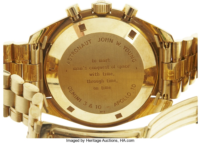 Apollo 10 was mainly used to ‘sort out the unknown’ before the planned moon landing with Apollo XI, in July that year. During Apollo 16, John W. Young did his first moon walk and drove the lunar rover, in 1972, together with Charles Duke. Astronaut Ken Mattingly stayed in the Command Module in lunar orbit. We covered Ken Mattingly’s gold Speedmaster in this article, this watch is in the Omega museum.