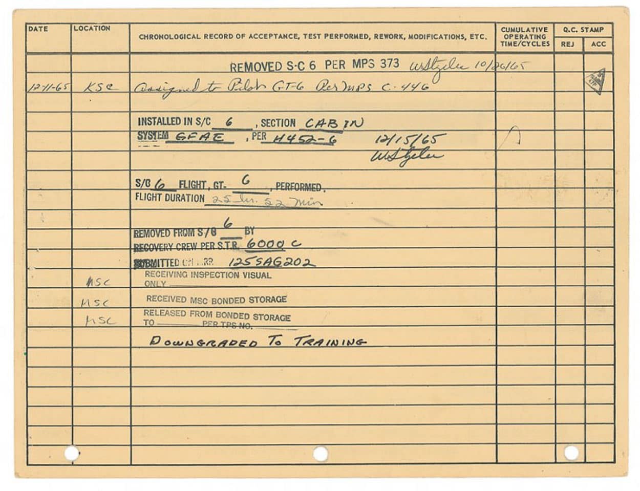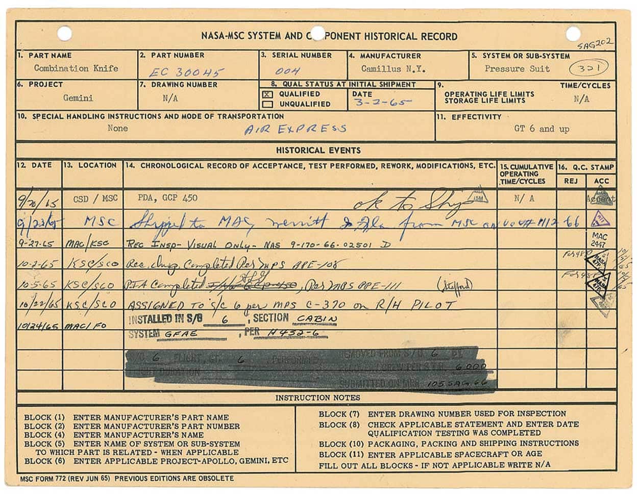 The knife depicted above spent 25 hours and 52 minutes in space on the Gemini 6 mission, late 1965. It has it original NASA serial numbers and documentation. Depicted knife and documentation were auctioned. (Pictures and information: silodrome.com).