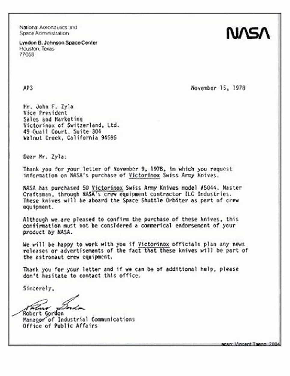 The Skylab program (1973-1974) proved that humans could live and work in outer space for extended periods of time. During these missions, astronauts on board had to repair or replace components from time to time. But they did not like to open a toolbox at zero gravity, because everything just popped out and flew around in the space lab. A Swiss Army Knife – in fact a pocket size tool kit – was the solution to this. No parts flying around and astronauts had just one tool to carry. Thus, in the late 1970’s, a subcontractor who was responsible for all NASA on board purchases bought 50 pieces of the Victorinox Master Craftsman knife for astronauts on board.