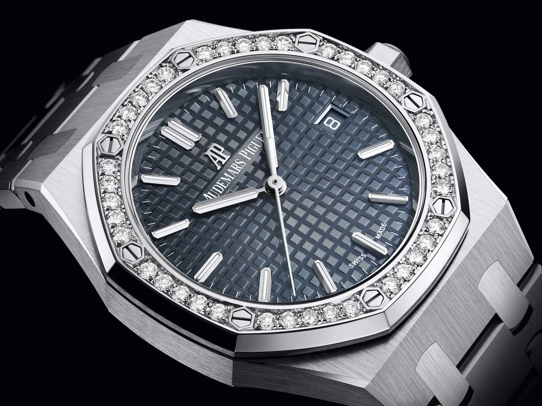 Audemars Piguet is a master of detailing. While the iconic silhouette and essential integrated bracelet remain, the angular 34mm case comes with a mixture of different decorations. We have “Grande Tapisserie” dials in silver or blue/gray, diamond bezels and plain bezels, simple steel or bicolor housings.
