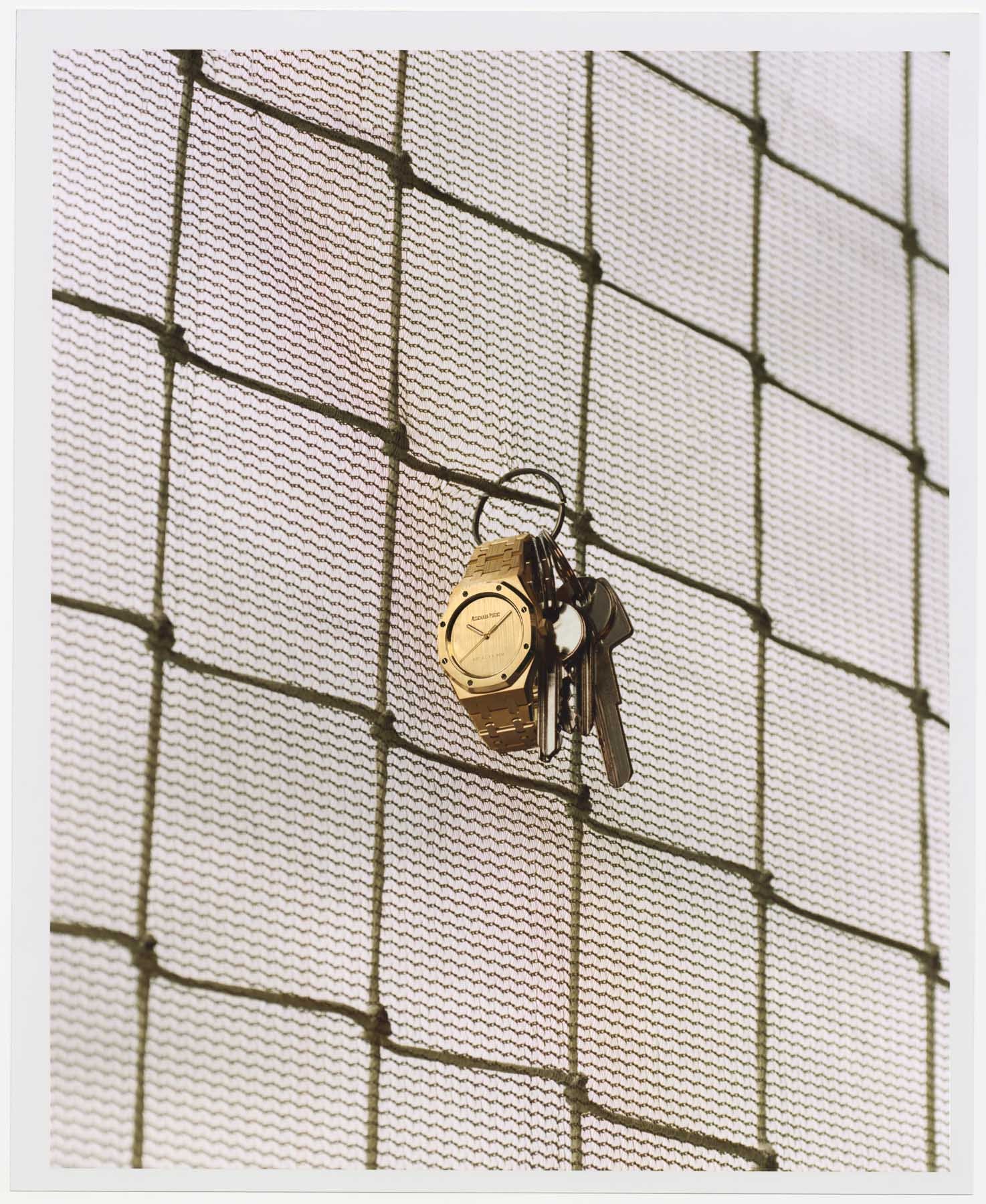 To keep the dial designs as clean-cut as possible, AP removed the hour markers and date aperture from the Royal Oak models. This emphasizes the vertically brushed finish of the gold dials. The 37mm three-hand automatic (15550BA.OO.1356BA.0) comes with luminescent yellow gold hands and features not only “Audemars Piguet” on the dial but also “1017 ALYX 9SM”, the former in gold applique and the latter transferred. The case is 18K yellow gold, water resistant to 50 meters, and equipped with a sapphire top crystal and case back. This case is relatively slim at 9.1mm. Inside it is AP’s automatic caliber 5909, introduced in 2022, with a 60-hour power reserve, 29 jewels, and a 28,800vph beat rate. This model has a price of CHF 65,700.