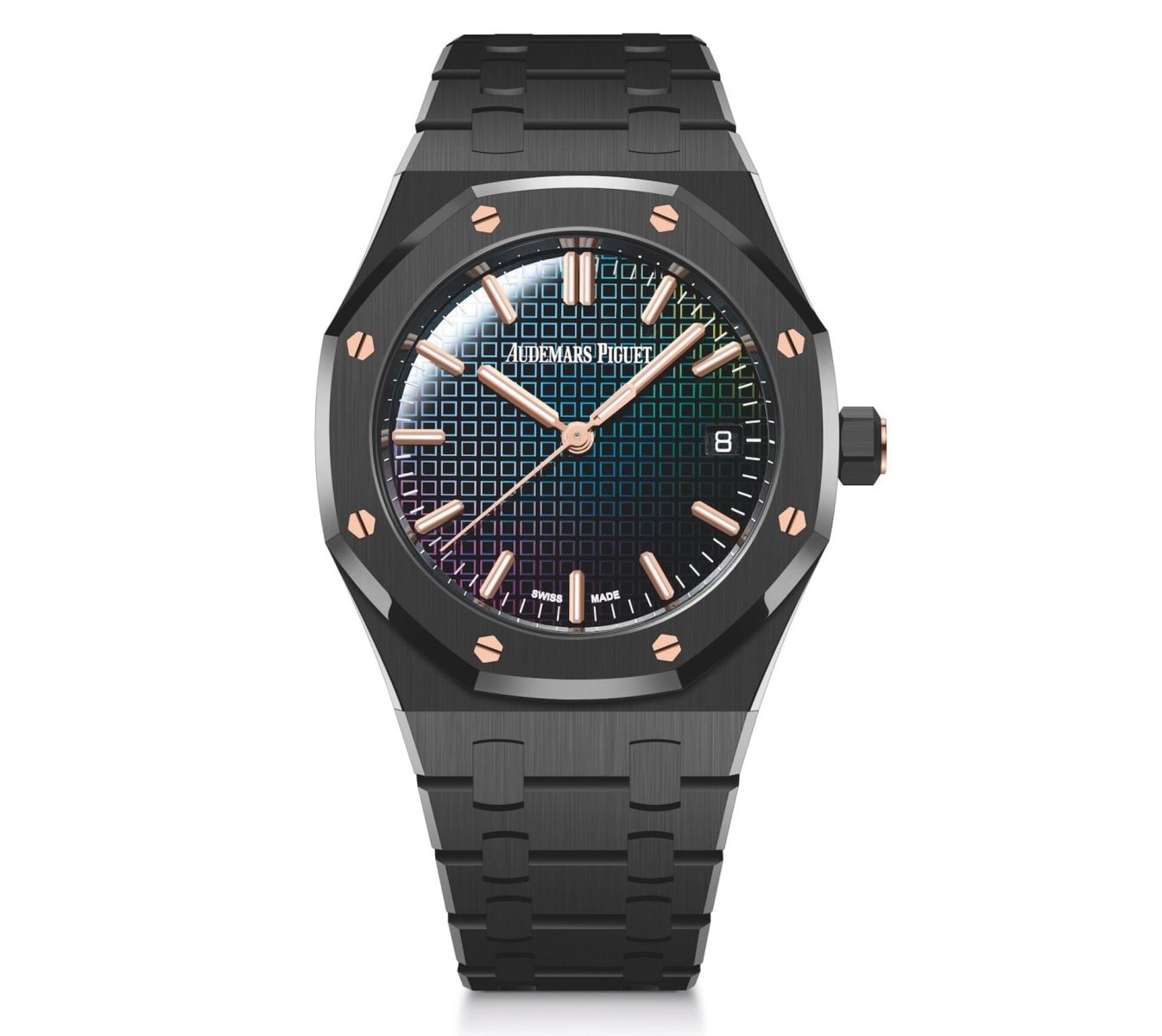 This unique dial displays the hours, minutes, seconds, and date at 3 o’clock. It features pink gold indices and Royal Oak hands with a luminescent coating. Surrounding them are eight hexagonal pink gold screws on the bezel, as well as a pink gold insert in the crown. These pink gold details stand out against the black ceramic case and bracelet for an exquisite contrast. In addition, polished chamfers on the case and bracelet bring a level of dynamism to the vertically brushed components.