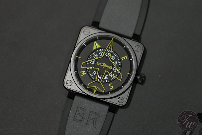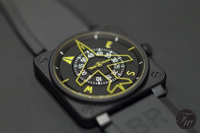 The Heading Indicator piece shows the time using rotating discs. Three discs are in place, for hours, minutes and seconds. Bell & Ross made the dial look like the original heading indicator instrument, using the W, E, S and hour indicator (N) on the hour disc. The yellow plane and hour (white and yellow) indices are engraved in (or better: under) the sapphire crystal.