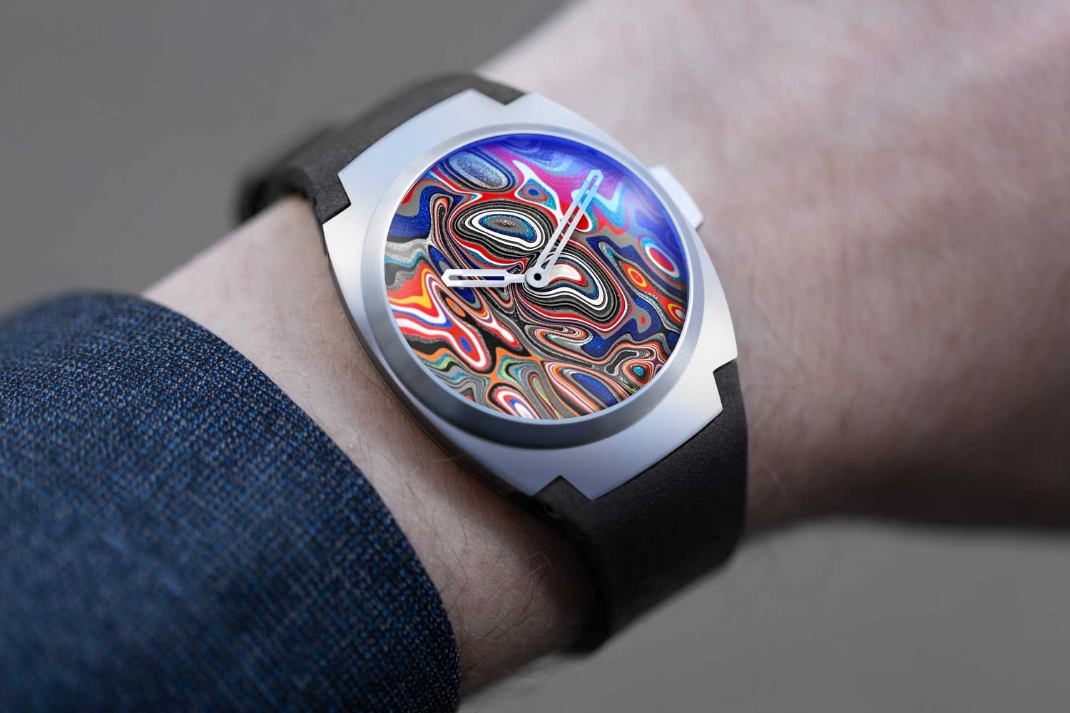 Enter the Arc II Fordite. The case is Arcaunaut’s classic 41mm stainless steel tonneau shape. You can choose from a wide range of colored rubber straps to affix to your wrist, which is nice as you’ll likely find something to complement your dial. By that, I mean that due to the nature of Fordite, every dial is wholly unique, not just in colors but in patterns too. Until James cuts the raw Fordite and starts to polish it, he has no idea what the finished dial will look like. If you look at the brand’s Instagram page, you’ll see a range of the different dials produced. Every single one of them is unique! The nice thing is that Arcaunaut also offers customers the chance to choose their dial rather than receive a random one — a nice touch indeed.