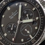 This dive watch is powered by a new automatic manufacture column-wheel chronograph (caliber F385) movement with flyback function. Using the flyback function, you can reset and instantly restart the running chronograph with just one push. Normally, chronographs need to be stopped first before you can reset and restart the chronograph function again. It is safe to do up to 300 meters depht using the water-resistant chronograph pushers. Unlike most water proof chronographs that have screw down pushers, the ones on the Bathyscaphe chronograph are always ready for use.
