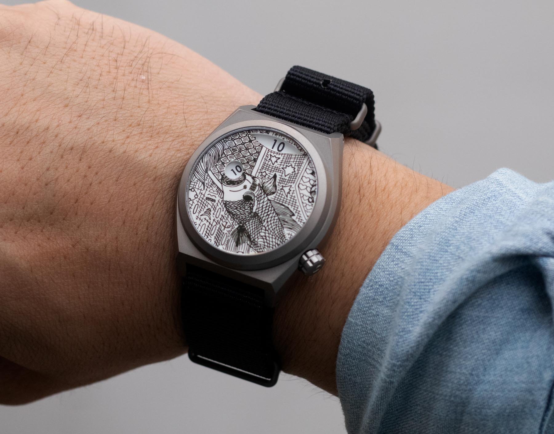 For watch lovers, of course, the most interesting thing here is the odd mode of telling the time, with the hours displayed through a leaf-shaped aperture around 12 o’clock, while the minutes are seen through a circular aperture overlaying the Koi carp’s mouth. The titanium case has a screw-down crown, water resistance to 200m, a wearable 38mm diameter, 12mm thickness, and a 44mm lug-to-lug, and is attached to the wrist via a 20mm wide fabric NATO. Powering this seldom-seen display is the Seiko NH35 movement.