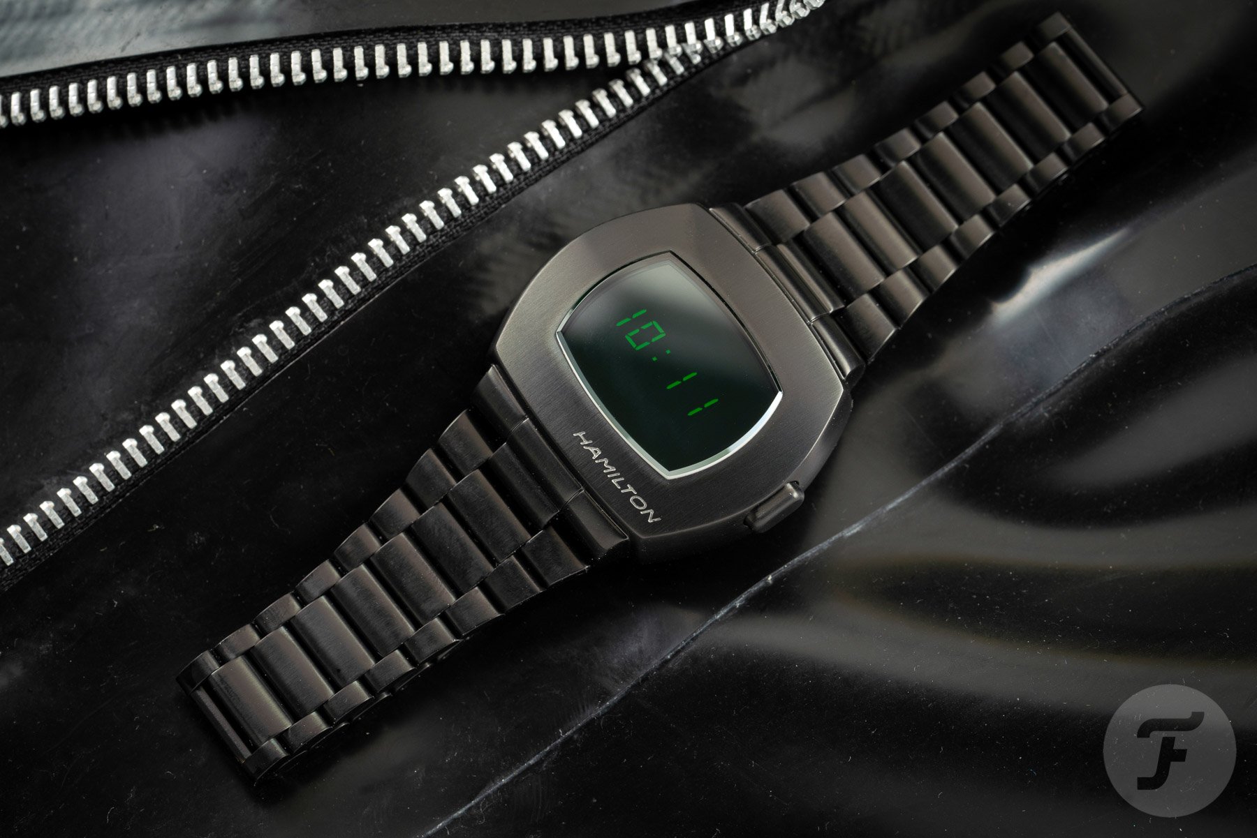 I previously mentioned the extreme taper of the bracelet, which measures a beefy 24mm at the lugs and a slim 19mm at the clasp. Made up of many small links, it’s very easy to size accurately for a comfortable fit. The 40.88 × 34.7mm case sits nicely on the wrist, thanks to its lug-less design. The black display is covered by a flat sapphire crystal. Next to it, on the brushed top of the case, you will find the engraved Hamilton signature. In the original, it was the model name “Pulsar” that was featured here. Overall, the cool ’70s look and modern murdered-out aesthetic work quite well together. After all, this watch was designed to look like a thing of the future. So the given the dystopian sci-fi Matrix treatment, it really looks incredibly cool.