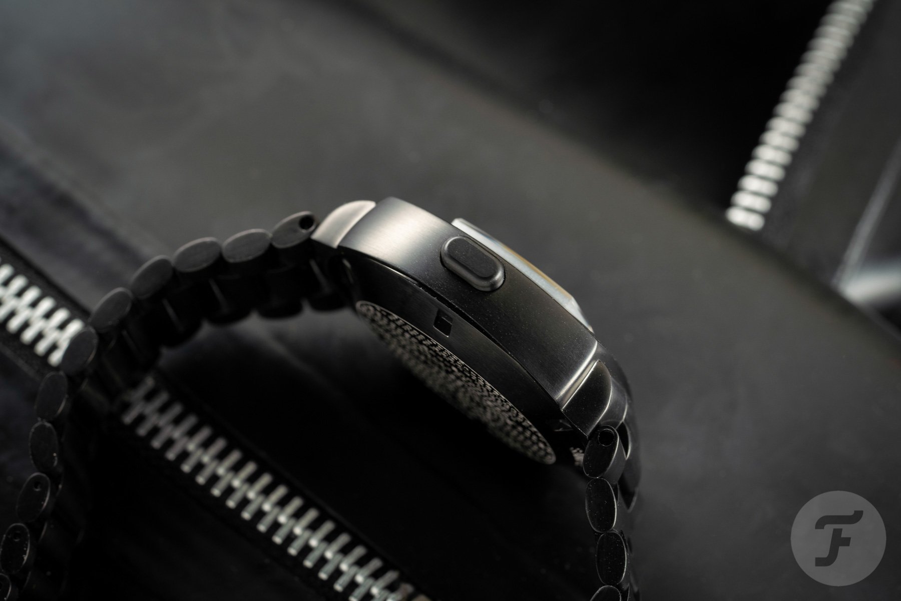 I previously mentioned the extreme taper of the bracelet, which measures a beefy 24mm at the lugs and a slim 19mm at the clasp. Made up of many small links, it’s very easy to size accurately for a comfortable fit. The 40.88 × 34.7mm case sits nicely on the wrist, thanks to its lug-less design. The black display is covered by a flat sapphire crystal. Next to it, on the brushed top of the case, you will find the engraved Hamilton signature. In the original, it was the model name “Pulsar” that was featured here. Overall, the cool ’70s look and modern murdered-out aesthetic work quite well together. After all, this watch was designed to look like a thing of the future. So the given the dystopian sci-fi Matrix treatment, it really looks incredibly cool.