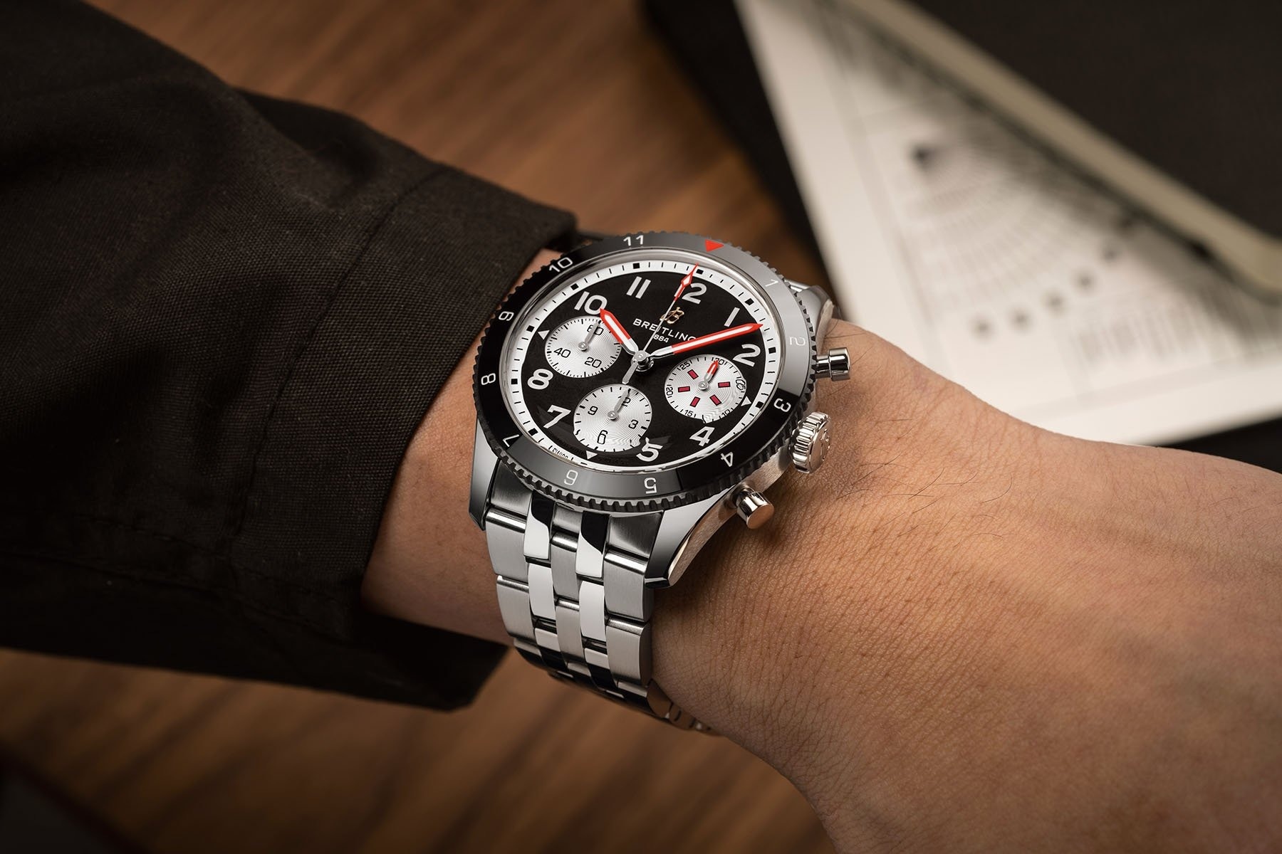 Saving the best for last, here’s the limited re-edition of the 1964 AVI Co-Pilot. This watch demonstrates the influence of esteemed vintage watch expert and Breitling consultant Fred Mandelbaum. The AVI Ref. 765 1964 is incredibly authentic to its vintage forebear from, you guessed it, 1964. This model has a black bezel, a reverse-panda dial, and a vibrant red triangle marker on the 12-hour scale. Breitling recreated these details while modernizing the materials and manufacturing techniques. For instance, the black bezel is amorphous diamond-like carbon (ADLC) for better durability. Likewise, keeping the spirit of the original is the hand-wound chronograph movement, the modern in-house Breitling B09, which is, essentially, a B01 without the rotor and more refined finishing. The lack of a rotor allows the 41mm stainless steel case to remain appropriately svelte at 14mm thick.
