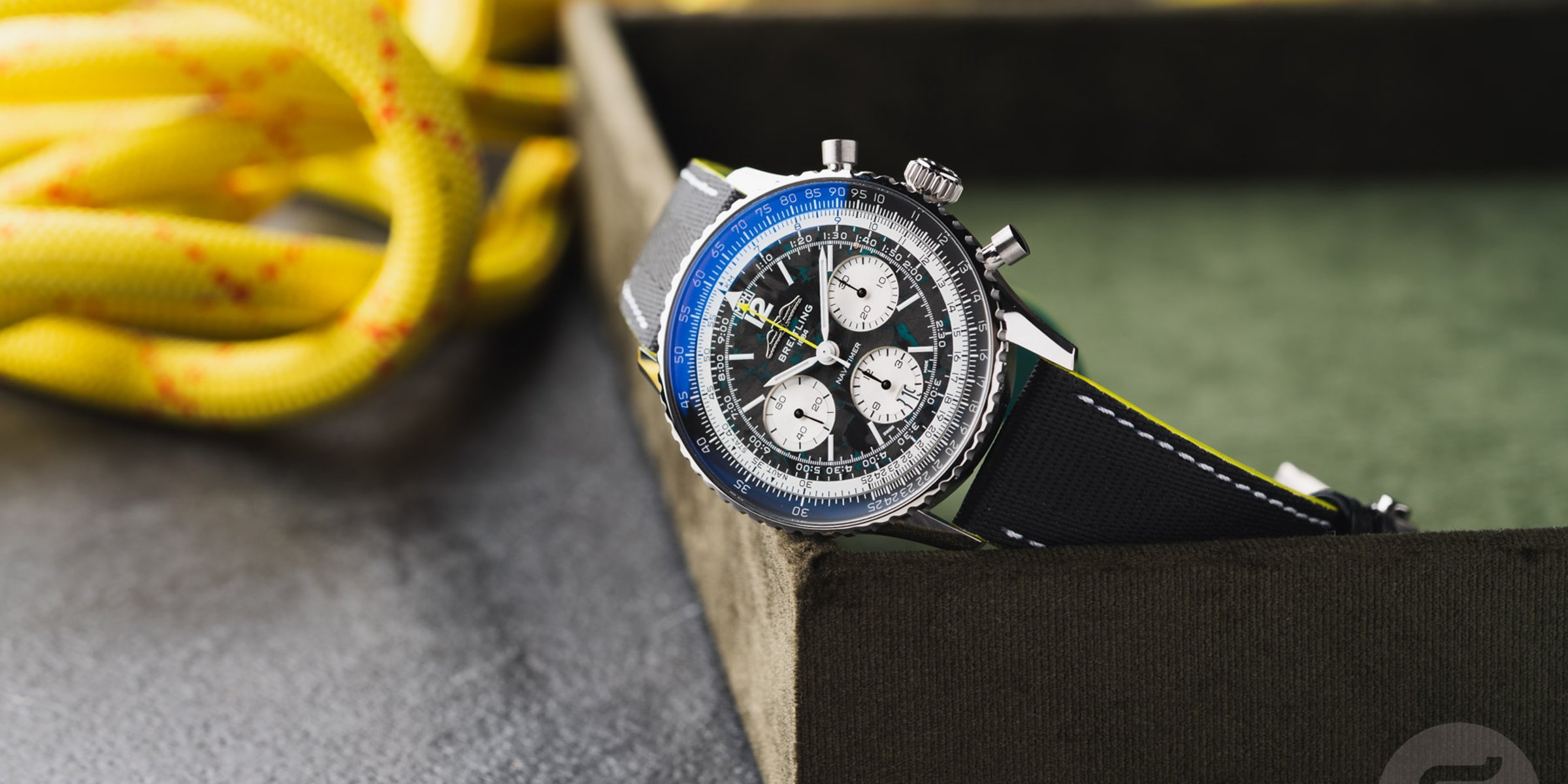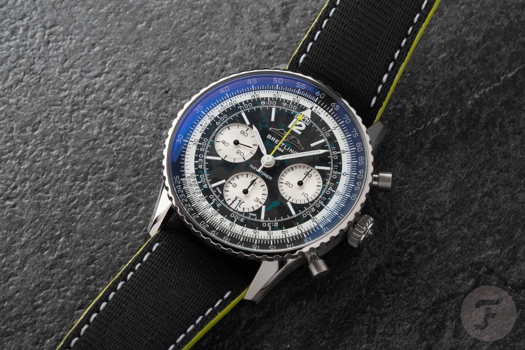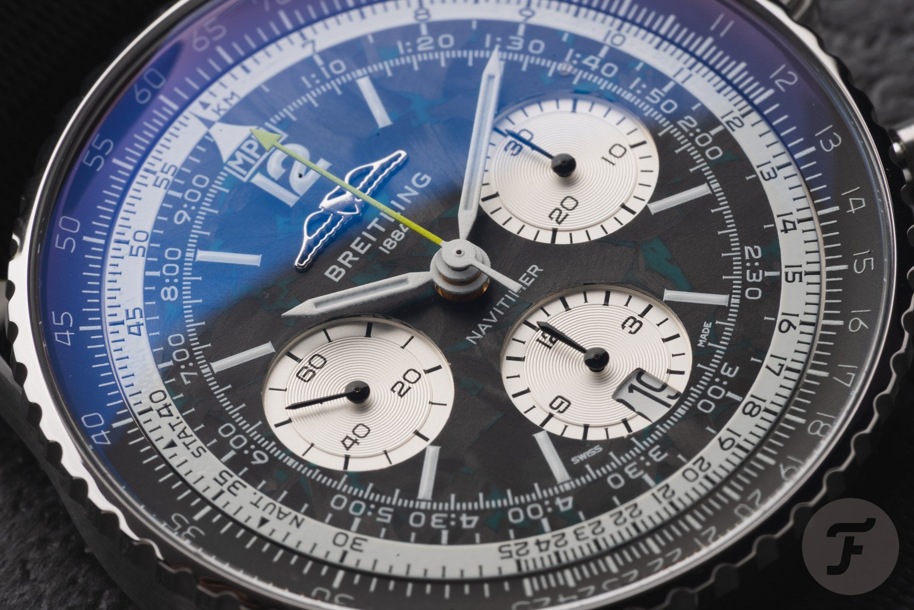 As you would expect, the Navitimer B01 Chronograph 43 Aston Martin Formula One Team reflects the team’s colors. In this case, it means you get accents in Aston Martin Racing Green and lime, derived from the Aston Martin Aramco livery. For the first time, the classic Navitimer (excluding the Navitimer Aerospace and Super 8) features a lightweight titanium case. Its size should be consistent with serial-production Navitimers, meaning the 43mm housing has a 49.07mm lug-to-lug length and a 13.69mm thickness. As usual, it also has a 30m water resistance rating. Paired with the lightweight case is a dial made of carbon fiber, the most common material in F1. To ensure the watch is easy to read in low-light conditions, like the Singapore nighttime Grand Prix, there’s plenty of luminous material on the hands and dial.