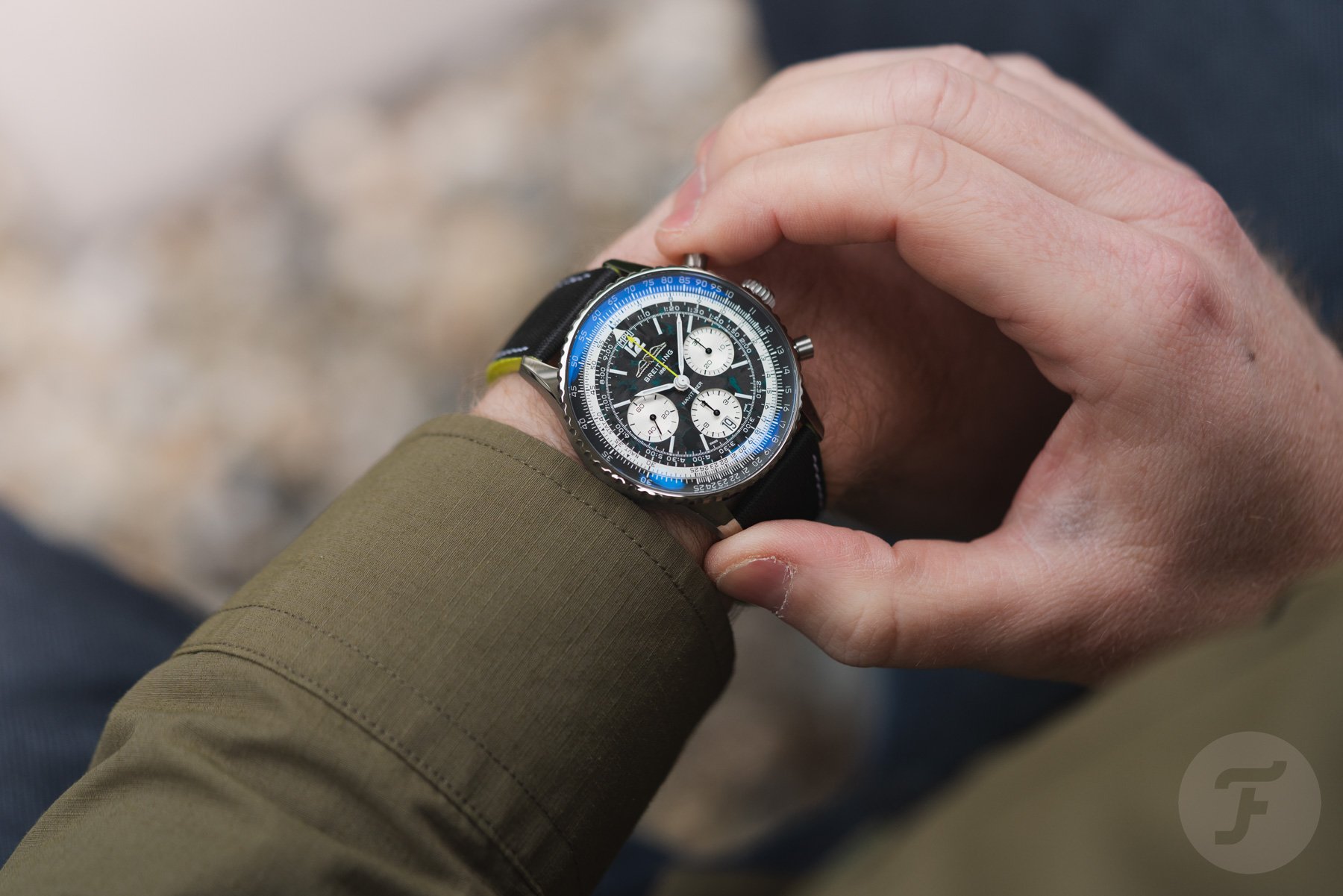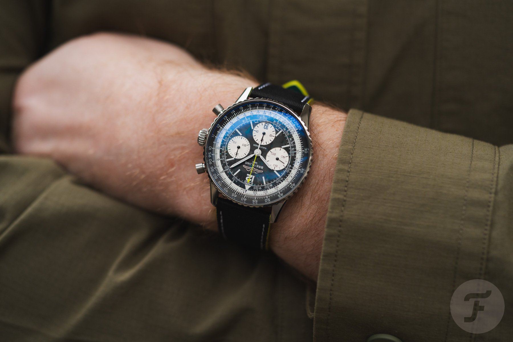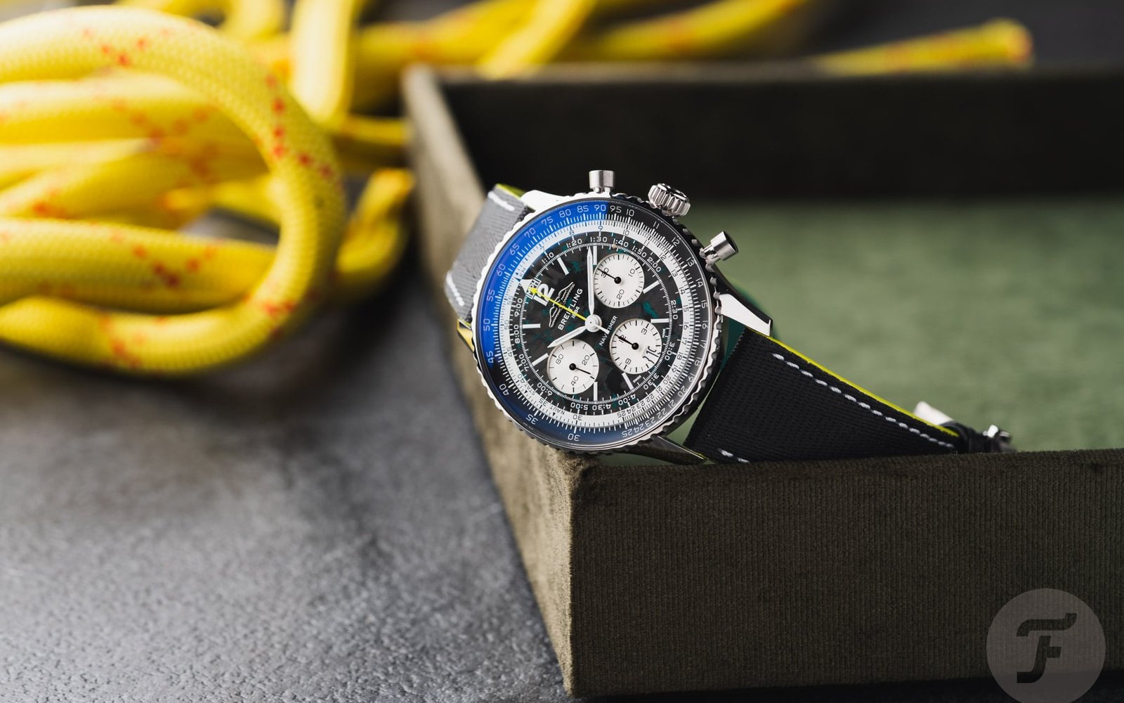 As you would expect, the Navitimer B01 Chronograph 43 Aston Martin Formula One Team reflects the team’s colors. In this case, it means you get accents in Aston Martin Racing Green and lime, derived from the Aston Martin Aramco livery. For the first time, the classic Navitimer (excluding the Navitimer Aerospace and Super 8) features a lightweight titanium case. Its size should be consistent with serial-production Navitimers, meaning the 43mm housing has a 49.07mm lug-to-lug length and a 13.69mm thickness. As usual, it also has a 30m water resistance rating. Paired with the lightweight case is a dial made of carbon fiber, the most common material in F1. To ensure the watch is easy to read in low-light conditions, like the Singapore nighttime Grand Prix, there’s plenty of luminous material on the hands and dial.