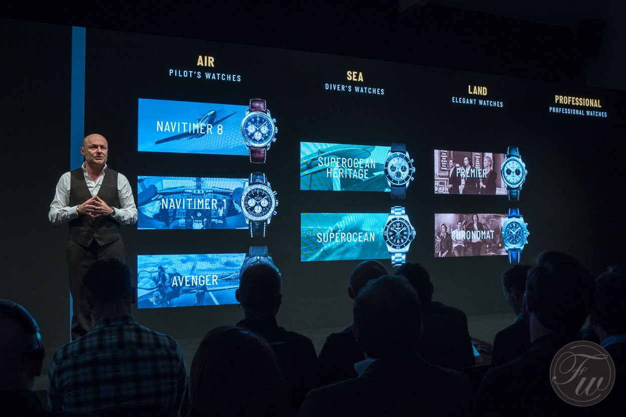 First, a word of welcome when Breitling’s CEO Georges Kern, takes the stage. He explains about the brand and its history and how to guide things in new and more clear directions as Breitling is not only about pilots watches. Structuring the collection into the 4 segments of land, sea air and professional. Each of which comes with a selected group of brand ambassadors or squad members as they call it. Also a quick introduction about new models but more on that later.