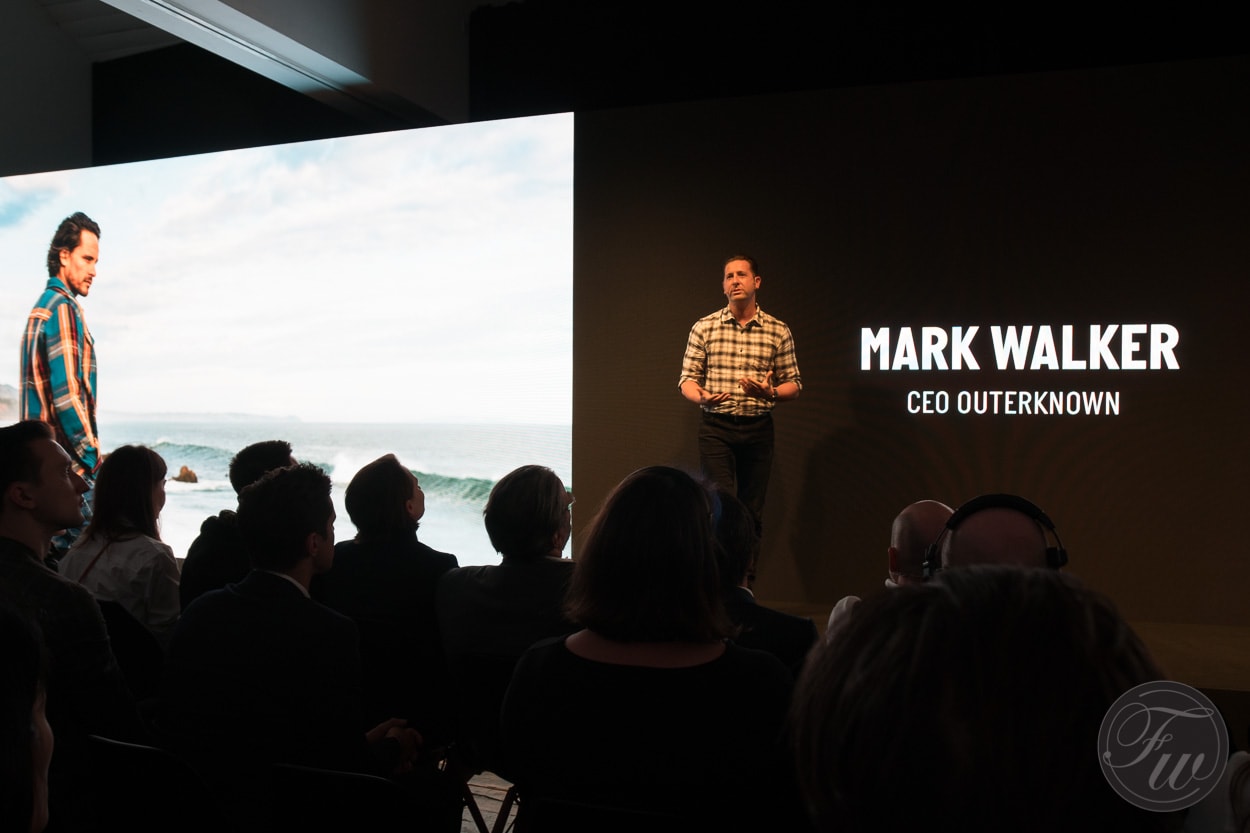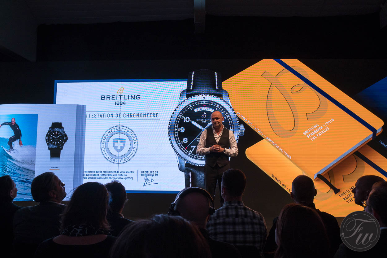 Interesting to learn is that Breitling clearly takes the environment into consideration. To emphasise this Mark Walker takes the stage. He’s the CEO of Outerknown, a company committed to improving environmental conditions. They create sustainable clothing and the company was co-founded by world-renowned surfer Kelly Slater. He’s part of the Breitling Surfers Squad. This is also when their Breitling Superocean Outerknown is presented.