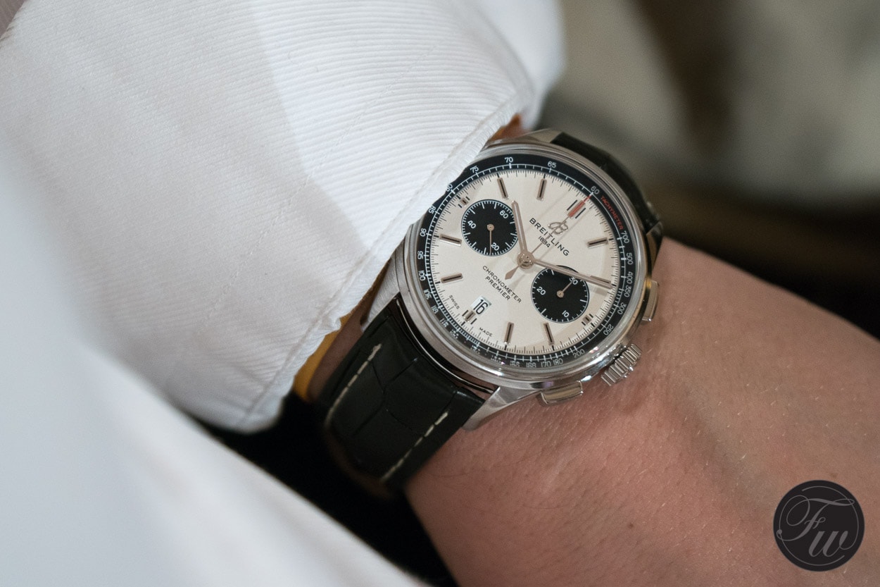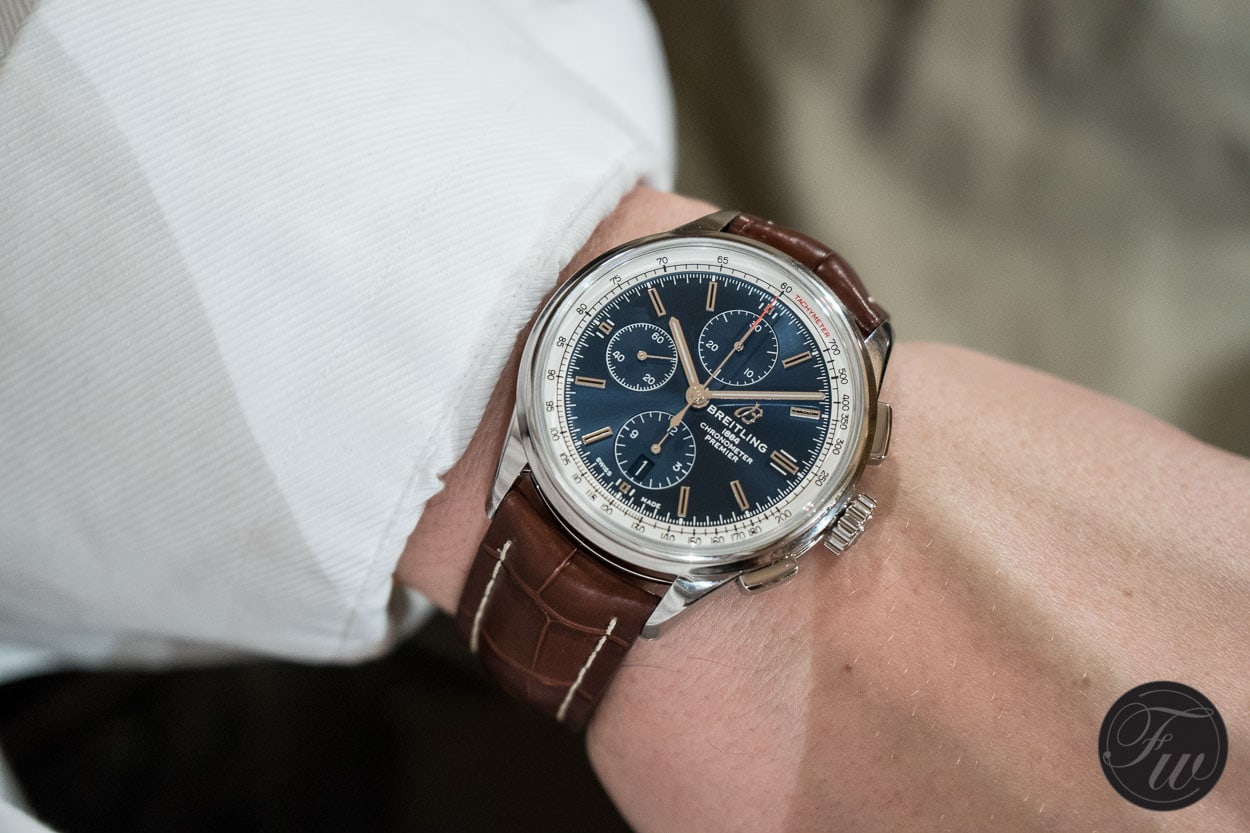 Depending on which configuration you prefer, prices for the Premier start at 4.100 Euro for the standard movement on a leather strap. The most expensive version is the chronograph with an in-house movement and metal bracelet which retails for 7.900 Euro. One simple way to tell if the chronograph has in-house movement is when the subdials have a contrasting colour. If the current Breitling chronograph watch comes with a dial in one colour it has a third party movement, as we explained earlier this year in this article.