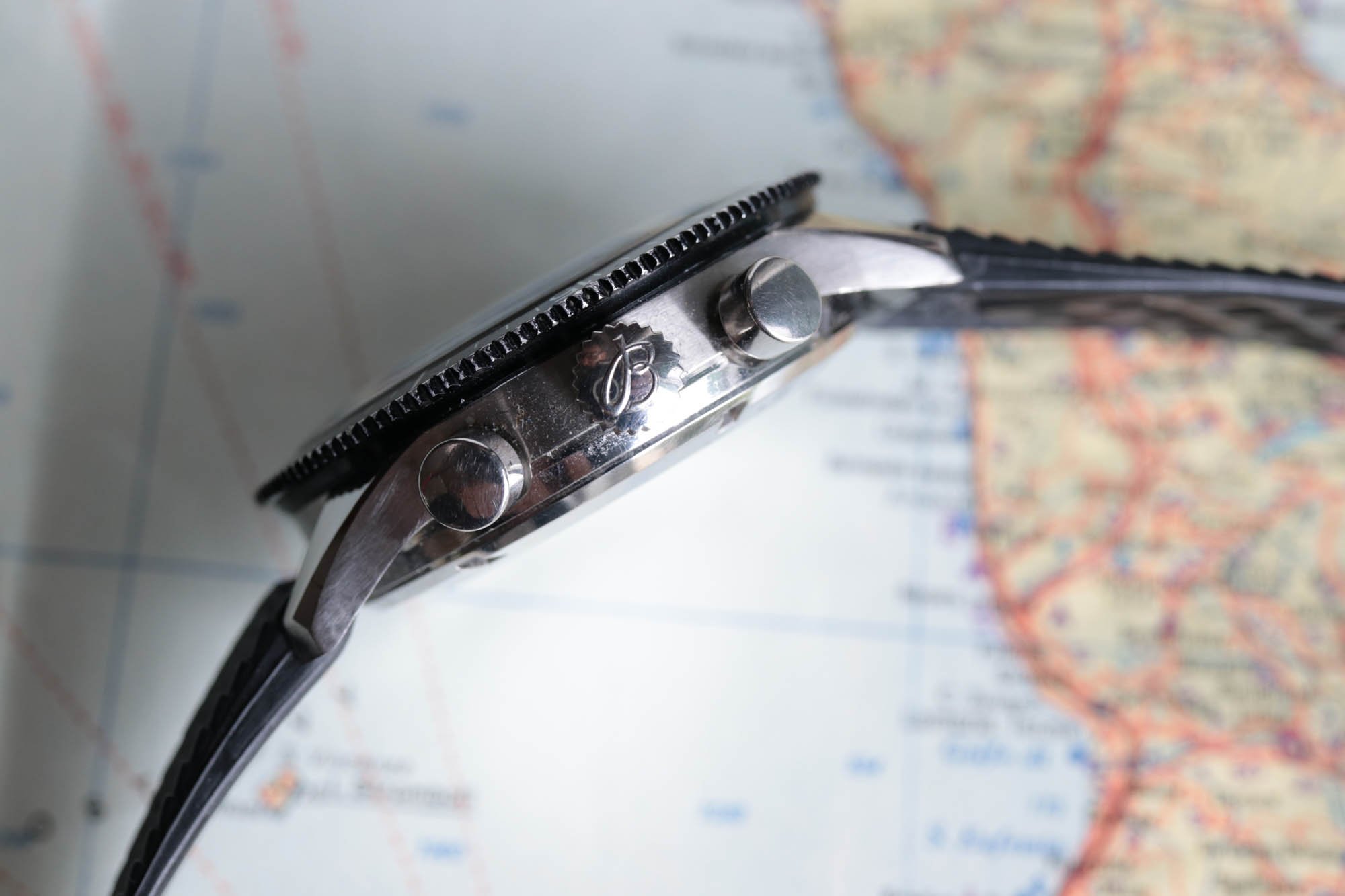 I always considered 1950-60s products being at least as designer driven as consumer driven. The variety and singularity of the divers from the late fifties confirms the creative freedom and construction originality of the time and this SuperOcean is no exception. The diamond shaped tip at the end of the minute dive counter crowns the chunky design of the Breitling SuperOcean ref 2005. It is so big you could easily flip pancakes with it. When you press the upper button, don’t expect any immediate movement. I bet that before the Internet ruled the watch market and before vintage watches were cool, some of the 2005 refs ended up forgotten in drawers simply because when you tested them by pressing the upper button and resetting with lower button, the central chrono did not move at all!
