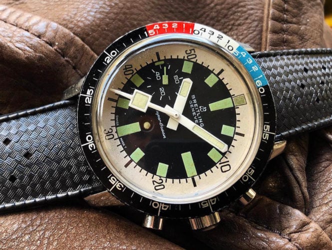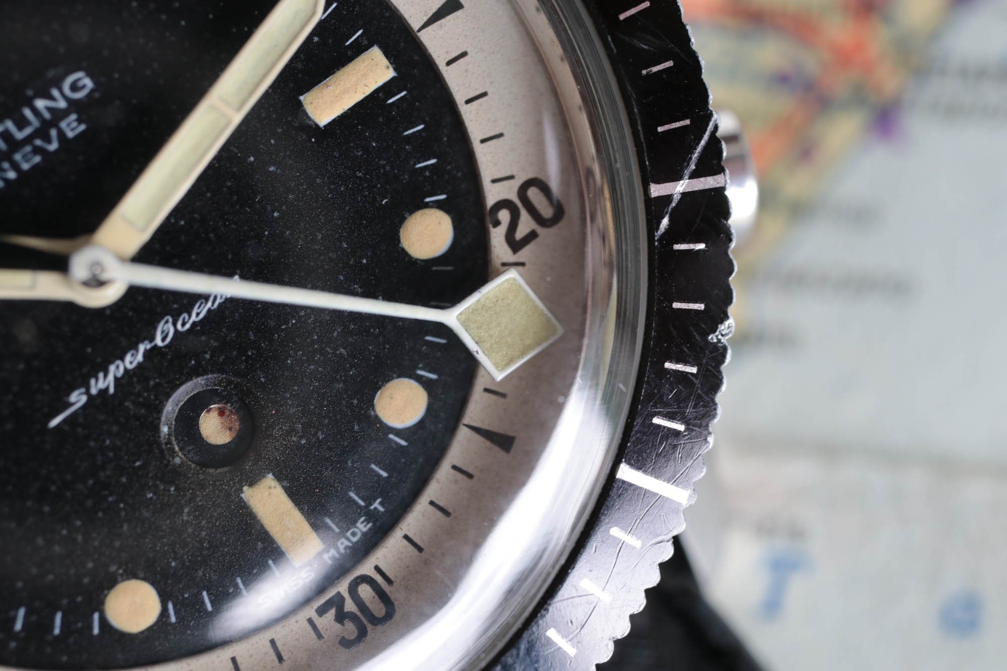 I spent some quality time on WhatsApp with respected collector and traveling encyclopedia Fred Mandelbaum (@watchfred) who has owned and/or inspected many SuperOceans and was featured in our Breitling Expert Interviews article. Beware of pieces that appear to be the most intact upon first sight. Perfectly matching lume would be a relume indicator, as the color and patina differences between hands and indexes is very typical, including slight differences on the diamond tip. Yet we have to add that if you would like to explore the wildest extremes of patinated tritium and aging from green to yellow, you would hardly find better studying material than the Breitling SuperOcean ref 2005.
