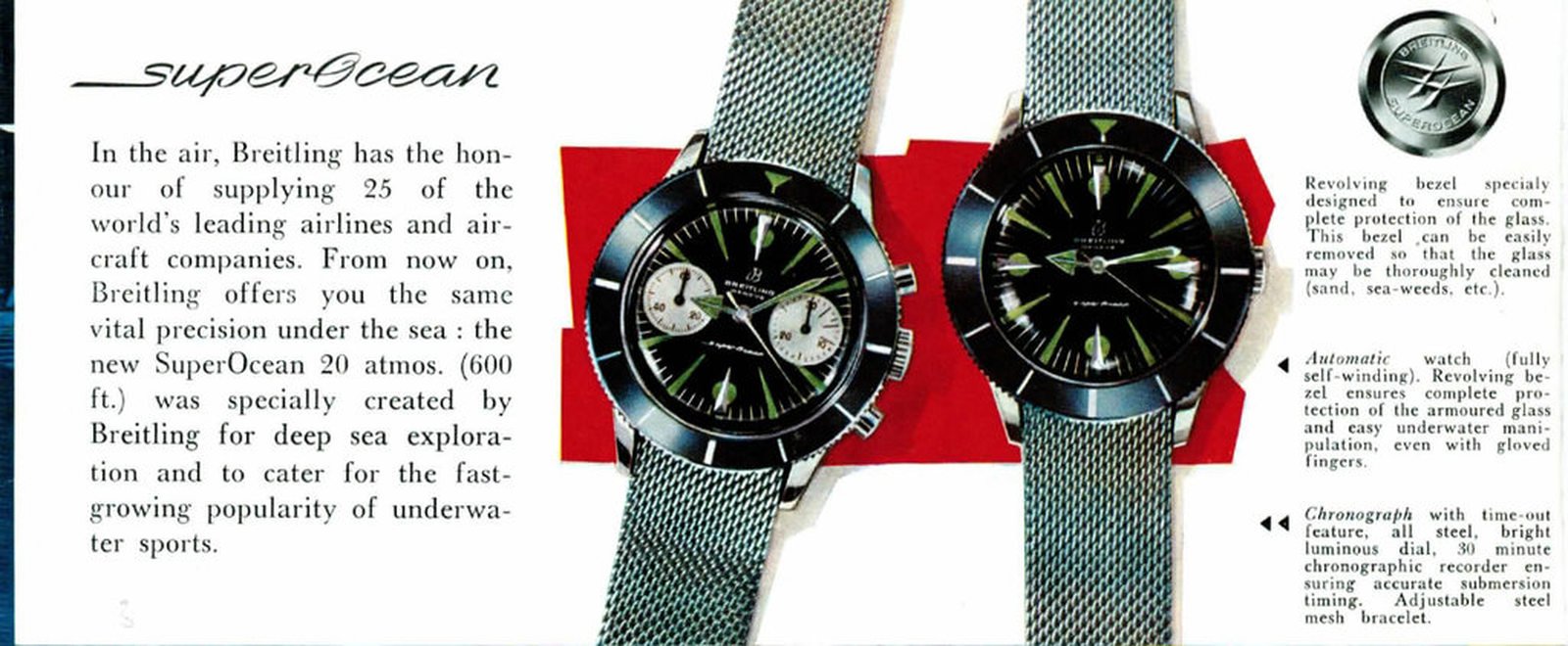 The first two references of the SuperOcean launched in 1957 took Breitling from the sky to unexplored waters. Unexplored, but starting to get crowded with strong characters such as the Rolex Submariner, Blancpain Fifty Fathoms or Omega Seamaster CK2913 as all were released the same year. You would need a considerable lump of cash today to get all four pioneers lined up on your watch roll. Every single model is daring in its design or construction. Today, 60 years since the release, you can clearly see that it was a period rich in creativity, with different brands coming up with ideas so bold they set trends for the next decades to come. The reverse panda, concave glass-protecting bezel and thin indexes longer than Uma Thurman’s legs make the early Breitling refs. 807 and 1004 highlights of any auction.