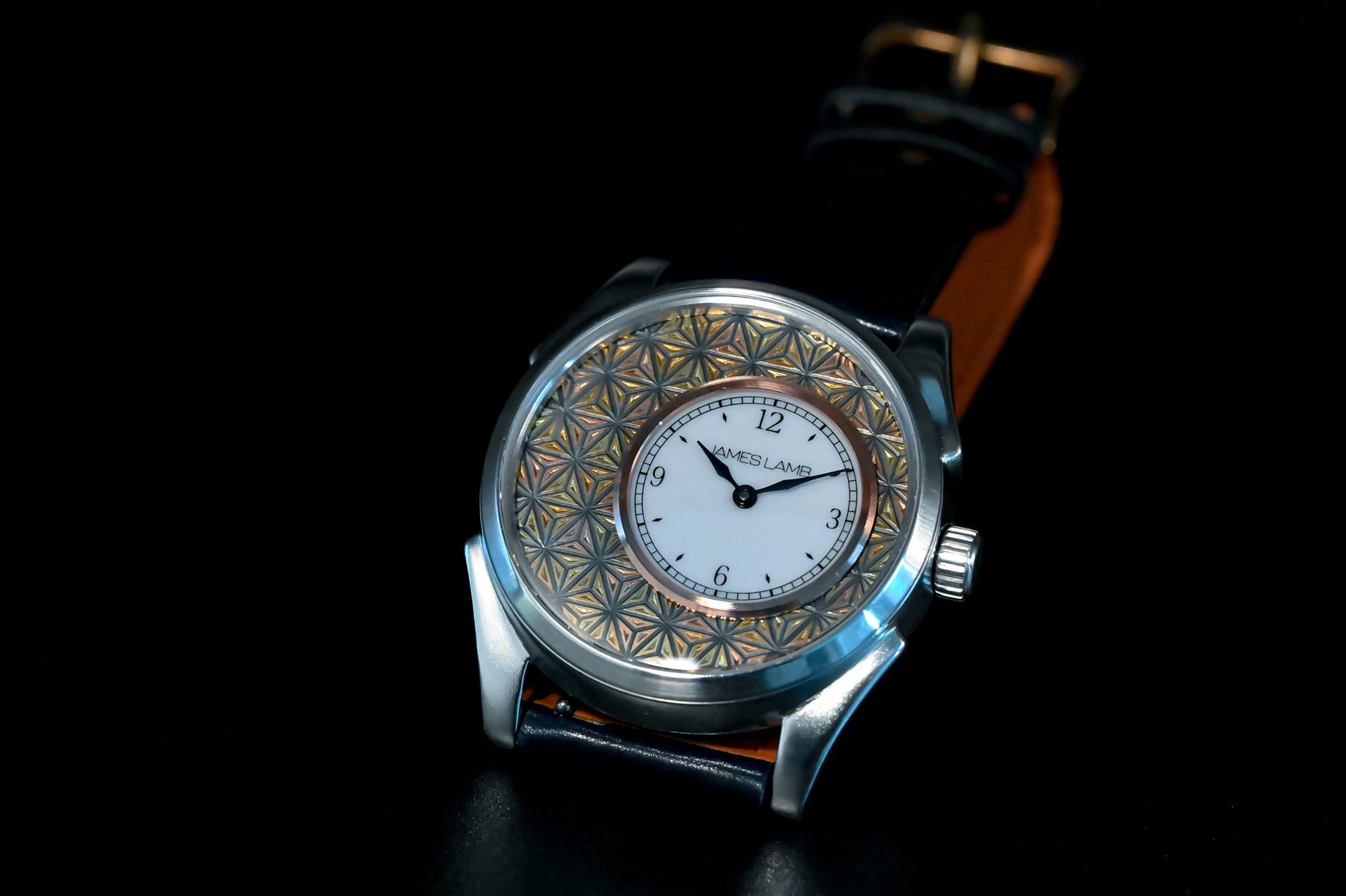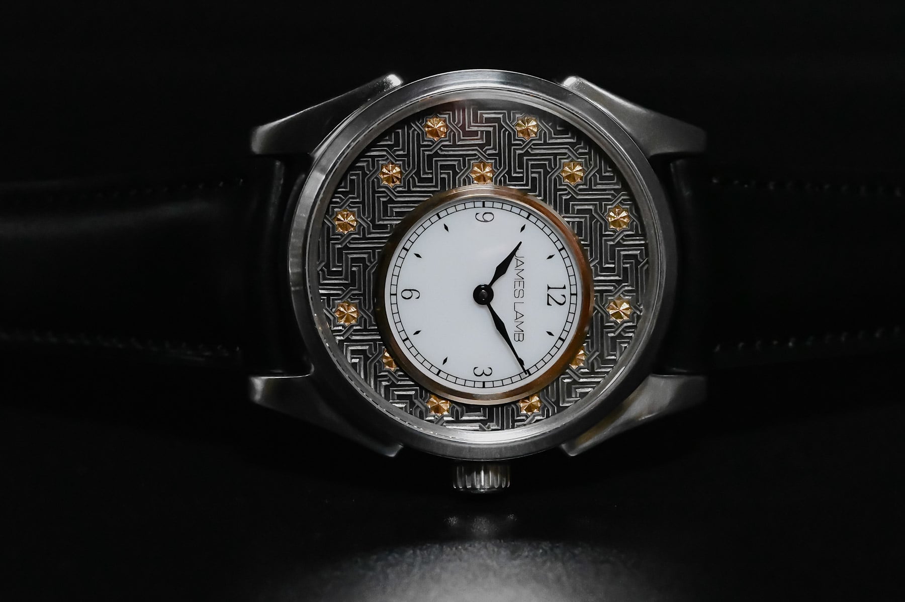 The watch has a 40.5mm diameter and features a faceted mid-case. The lugs have a 47.5mm span from tip to tip and accommodate 22mm-wide leather straps. Including the pressure-fit case back made of solid 940 Argentium silver, the Linea Edition also has a 12.8mm profile. Andy Roberts engraved the case back with a geometric motif and a James Lamb logo. After that, he also meticulously filled it with black and gold enamel. Underneath the case back lies a high-grade Sellita SW210 hand-wound movement to power the watch. It beats at 28,800 vibrations per hour and holds a 42-hour power reserve.