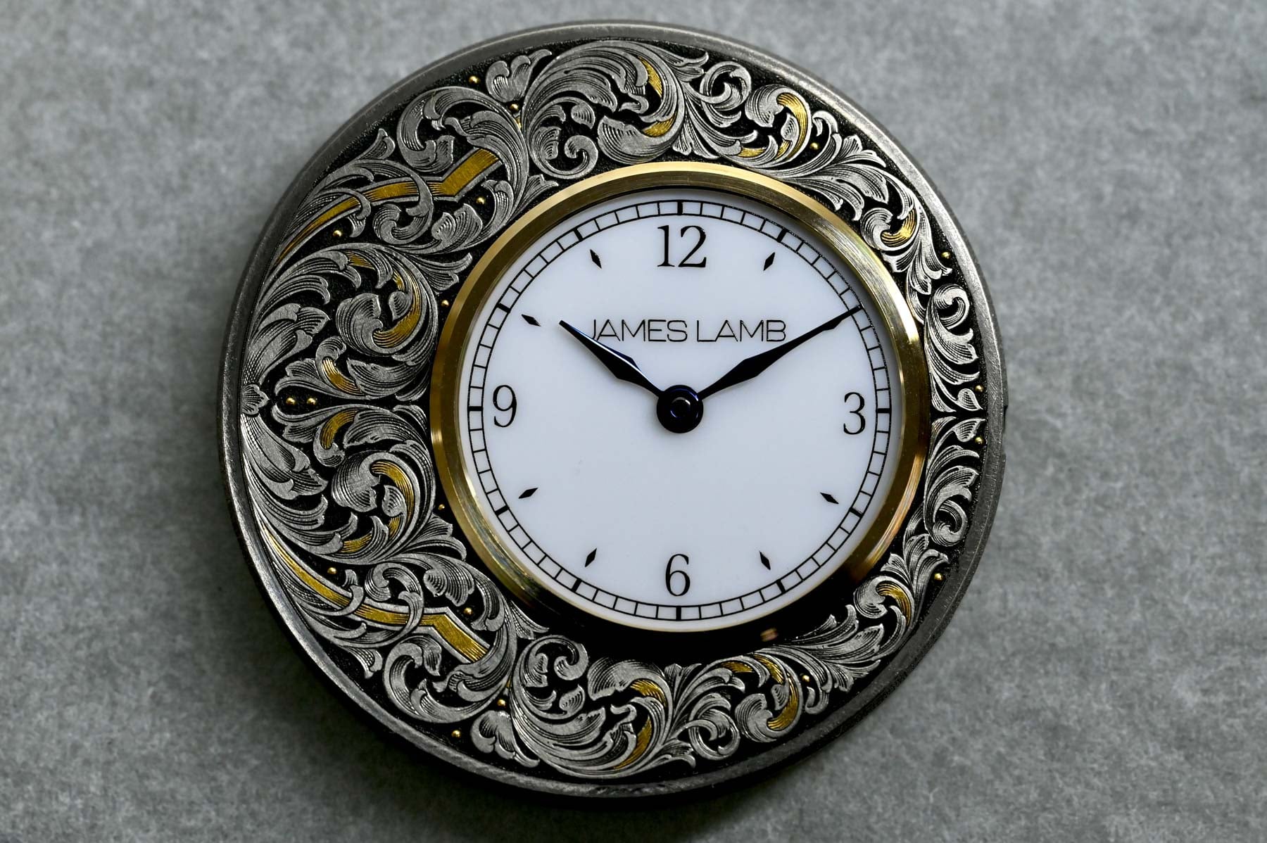 Finally, we arrive at the mesmerizing hand-engraved titanium dials featuring 18K gold inlays and a frosted ceramic sub-dial within a 14K gold rim. James told me that Joanne Ryall made him choose between stainless steel and titanium. Those materials are hard enough to cut while keeping a nice edge and firm enough to allow the gold inlay to be pressed in without damaging the motif. He decided to go for titanium because of its richer, darker tone that contrasts nicely with gold.