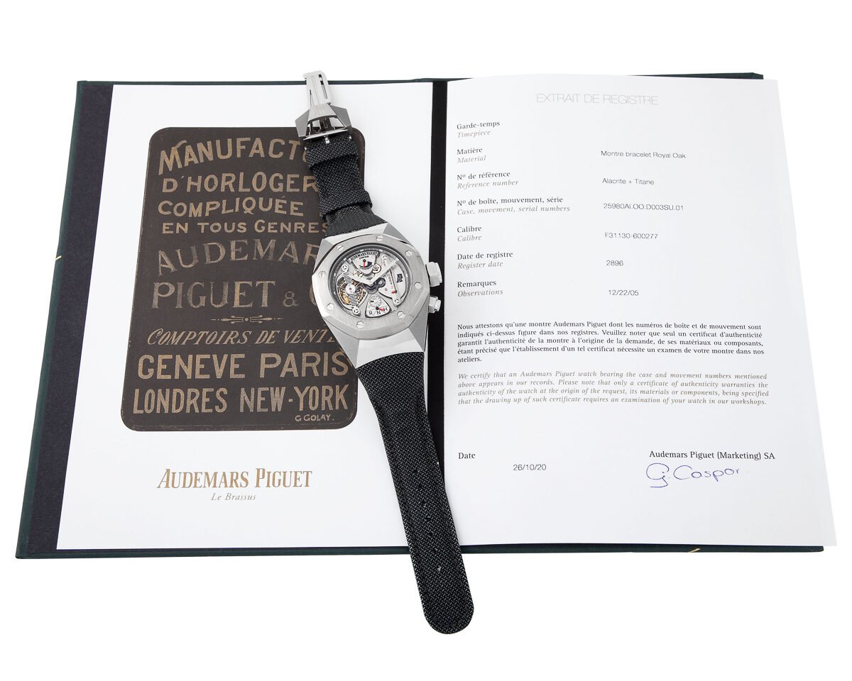 The watch that started it was the Audemars Piguet Royal Oak Concept ref. 25980AI that was released in 2002. The watch was produced in a limited-edition run of 150 pieces to celebrate the 30th anniversary of the Royal Oak. The watch features a 44mm case made of Alacrite 602 with the bezel made of grade 5 titanium. Alacrite 602 is a unique cobalt alloy made from 57% cobalt, 31% chrome, 5% tungsten, with trace amounts of carbon, silicon, and iron. The material is incredibly hard to machine and has a hardness rating of 430 Vickers, roughly twice the hardness rating of 316L steel. It is why the case production alone takes up to 60 hours.