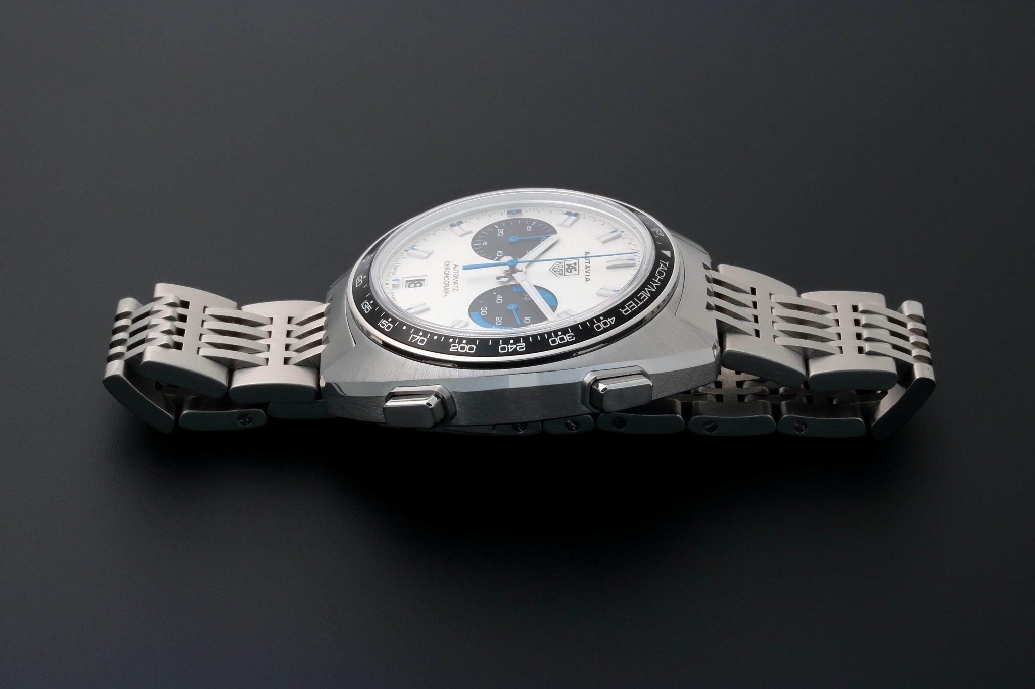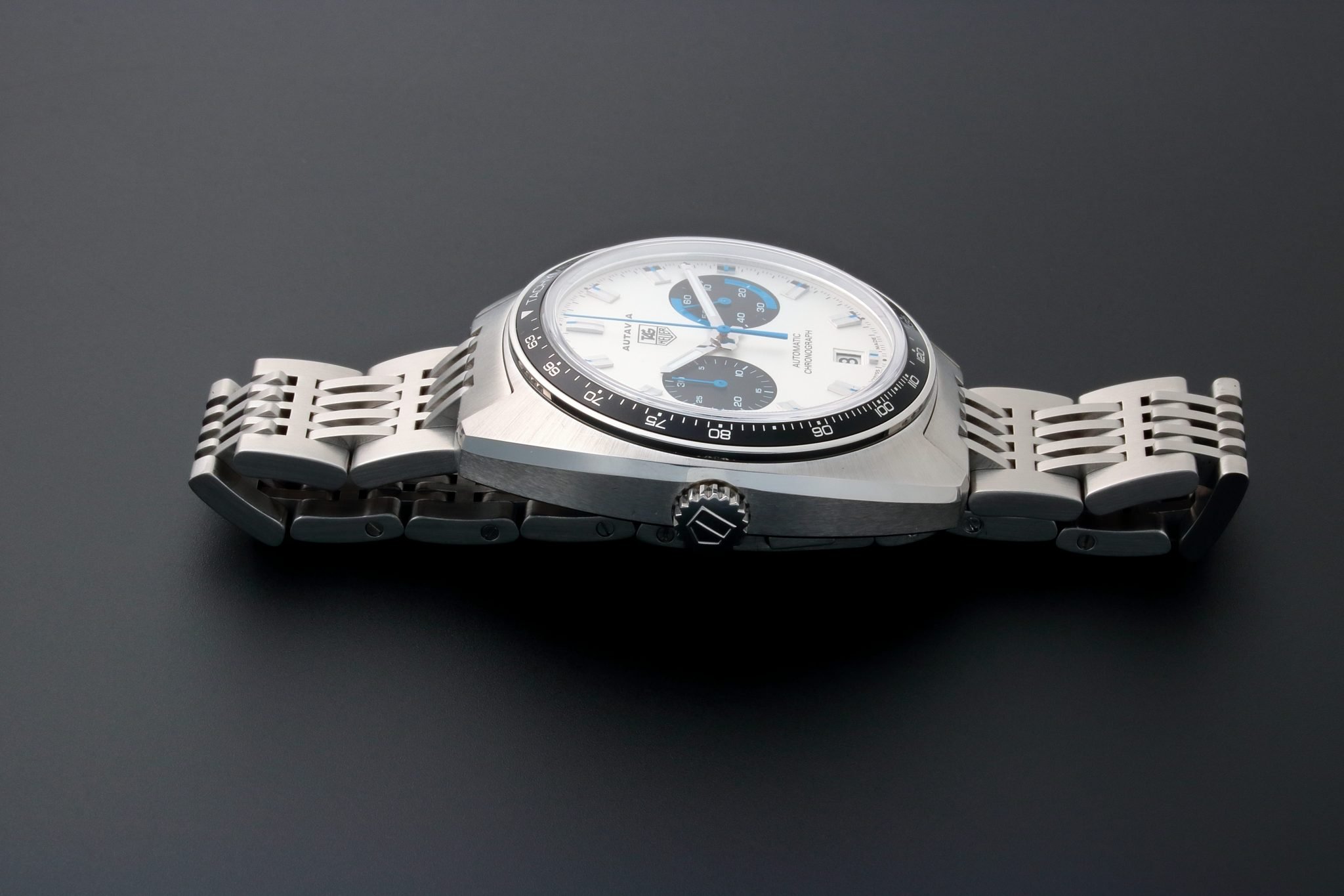 The second was this Autavia CY2110 that came with the iconic white dial with black registers and blue details. This design turned out to be more popular with collectors, as it refers back to the original 1163T. The dial of the re-issue, however, is not crisp white. Rather, it has a metallic or pearlescent feel to it. The watch featured a 43mm stainless steel case that offered a friendly 48mm lug-to-lug and a 20mm lug width. This Autavia also came with a remake of the classic stainless steel G&F “Grains of Rice” bracelet that still looks amazing. Unlike the 1970s original, the bezel of this model did not rotate. On top of that, this was the first time the brand used the TAG Heuer logo on the dial of a classic re-issue.