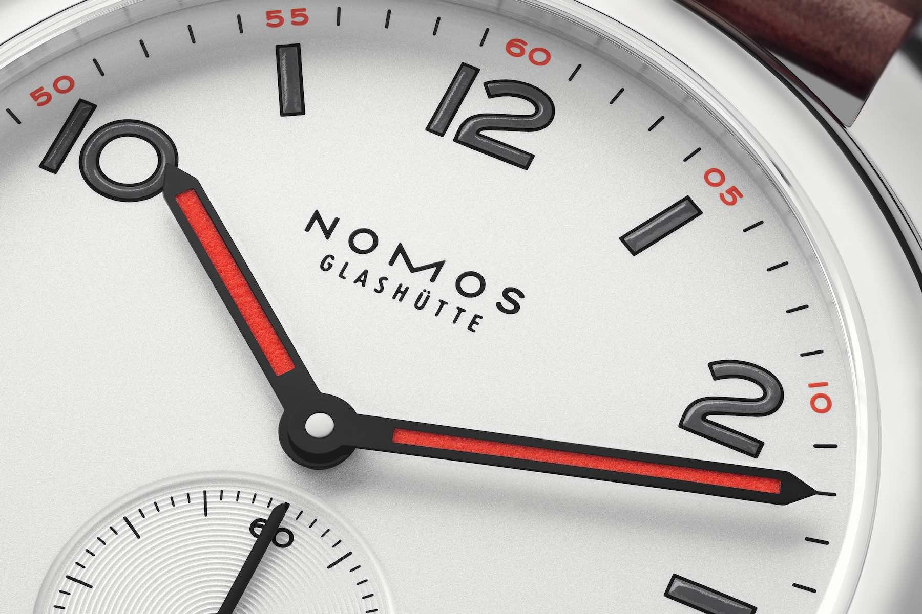 The look of that original Nomos Club 701 was called “hell,” which, in German, means “bright.” It had a white/silver dial with dark gray numerals and black hands. The hour and minute hands were filled with a red substance, which didn’t have any luminous capacity. Its color, however, did match the bright numerals in the dial’s minute track.