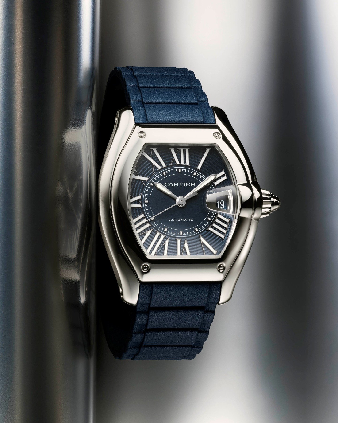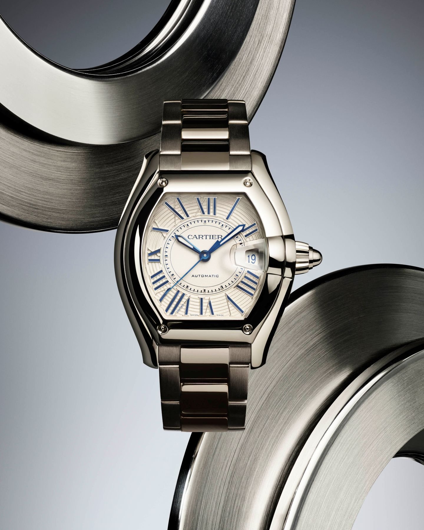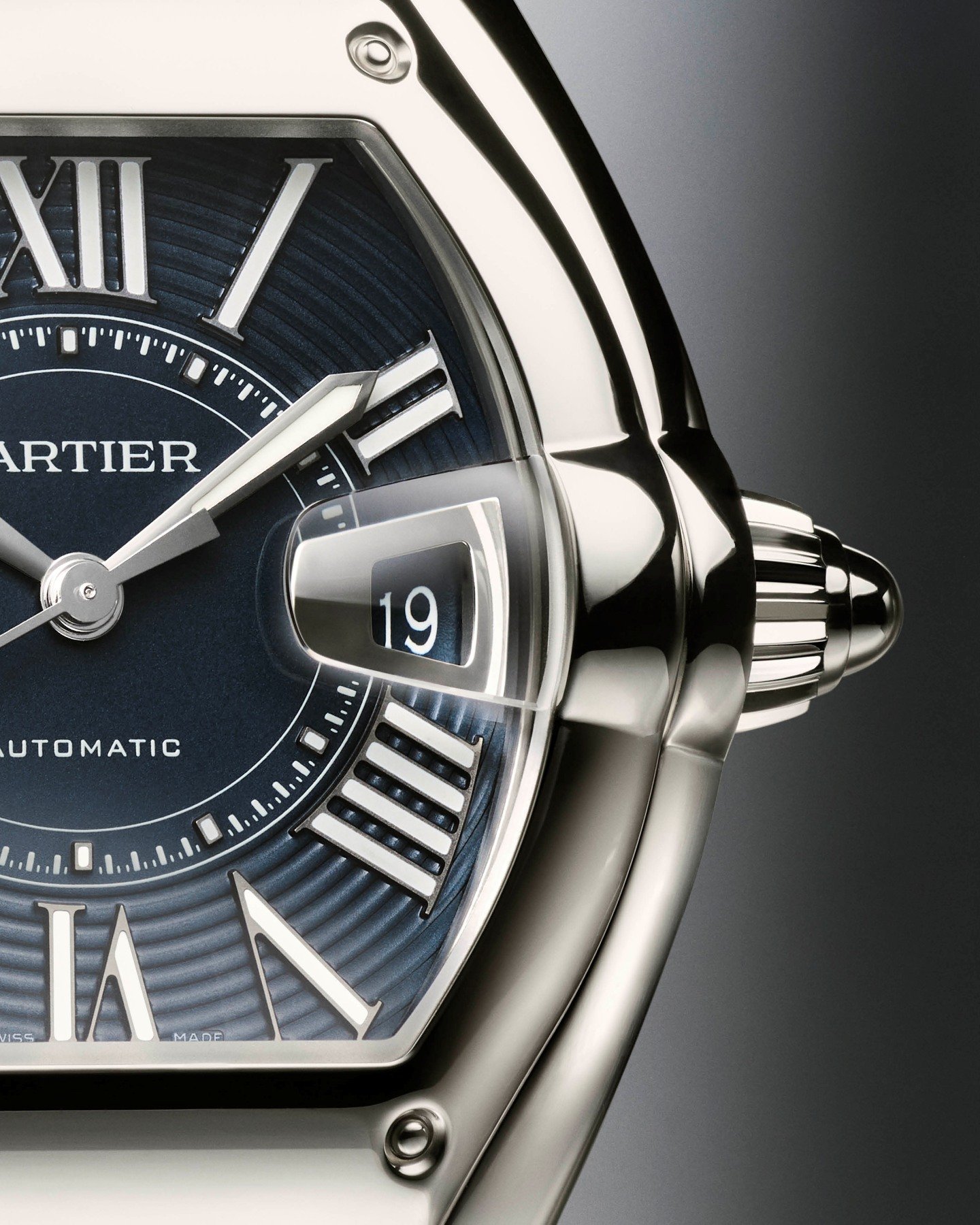 What’s the first thing that strikes you when looking at a Roadster? Is it the typical Cartier dial you won’t confuse with anything else, or is it the voluptuous date window? Let’s call it a tie. And therefore, let’s first look at the dial. The Roman numerals dictate the overall look, but the dial also shows a subtle reference to automotive instrumentation. The combination of a dynamic circular striated pattern, Roman numerals, and a chemin de fer track balances traditional and contemporary elements. Also, the use of applied Roman numerals is new and adds more depth to the dial than printed ones.