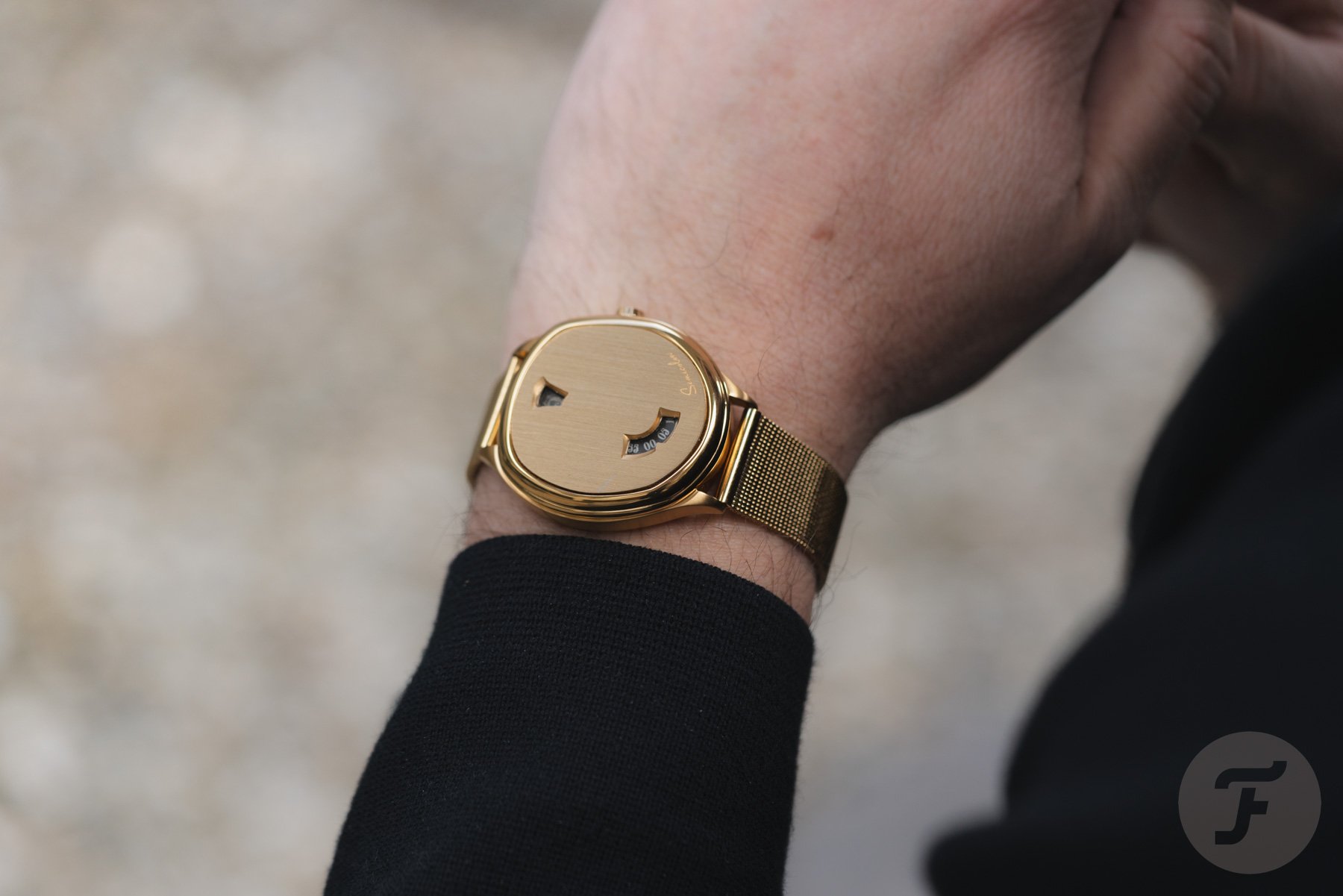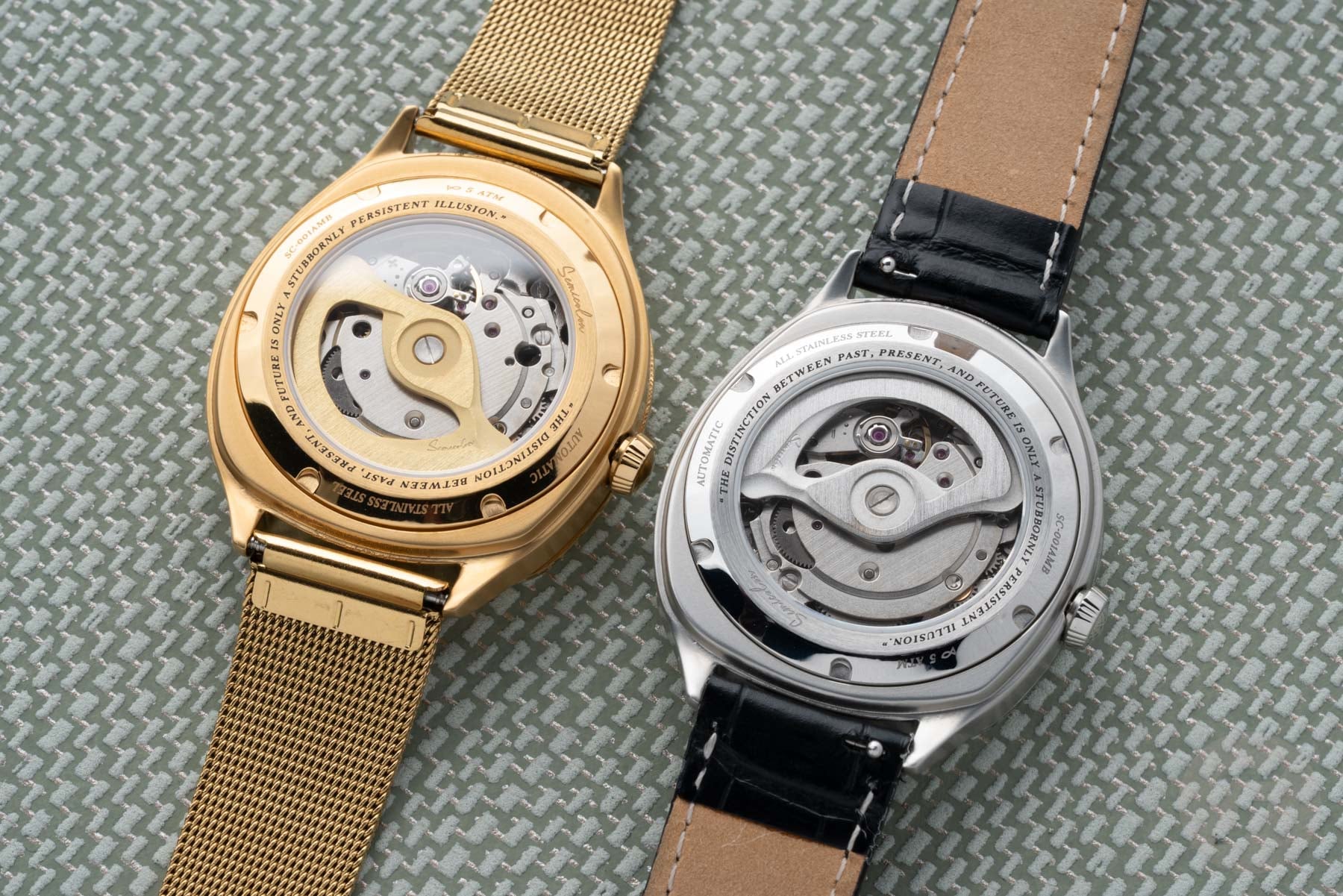 Now, as you can see in the pictures, Semicolon sent us two versions of the Anachron for review. The first is a stainless steel version on a black leather strap, and the second is a gold-colored version with a matching mesh bracelet. Stylistically, I understand the fun factor of the gold-tone version, but the unplated steel one is easier to take seriously, and I naturally gravitated to it.