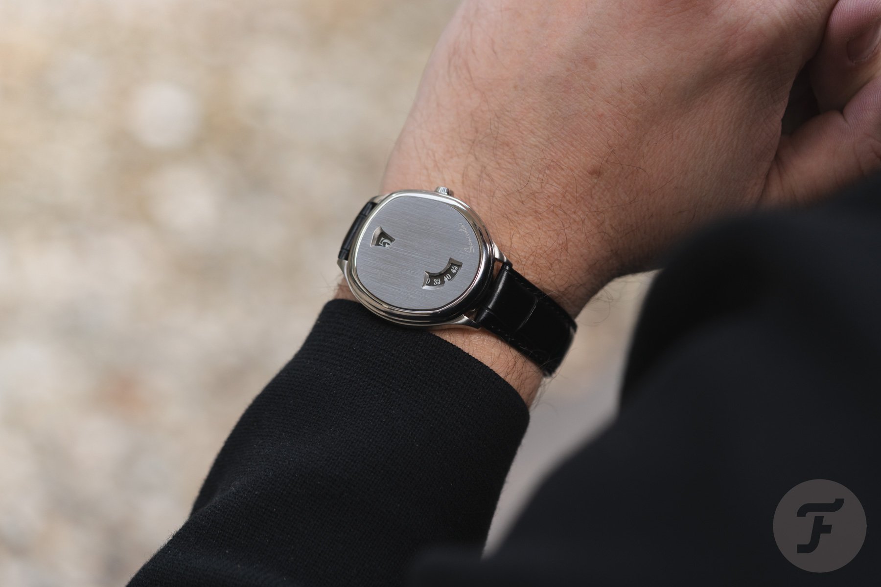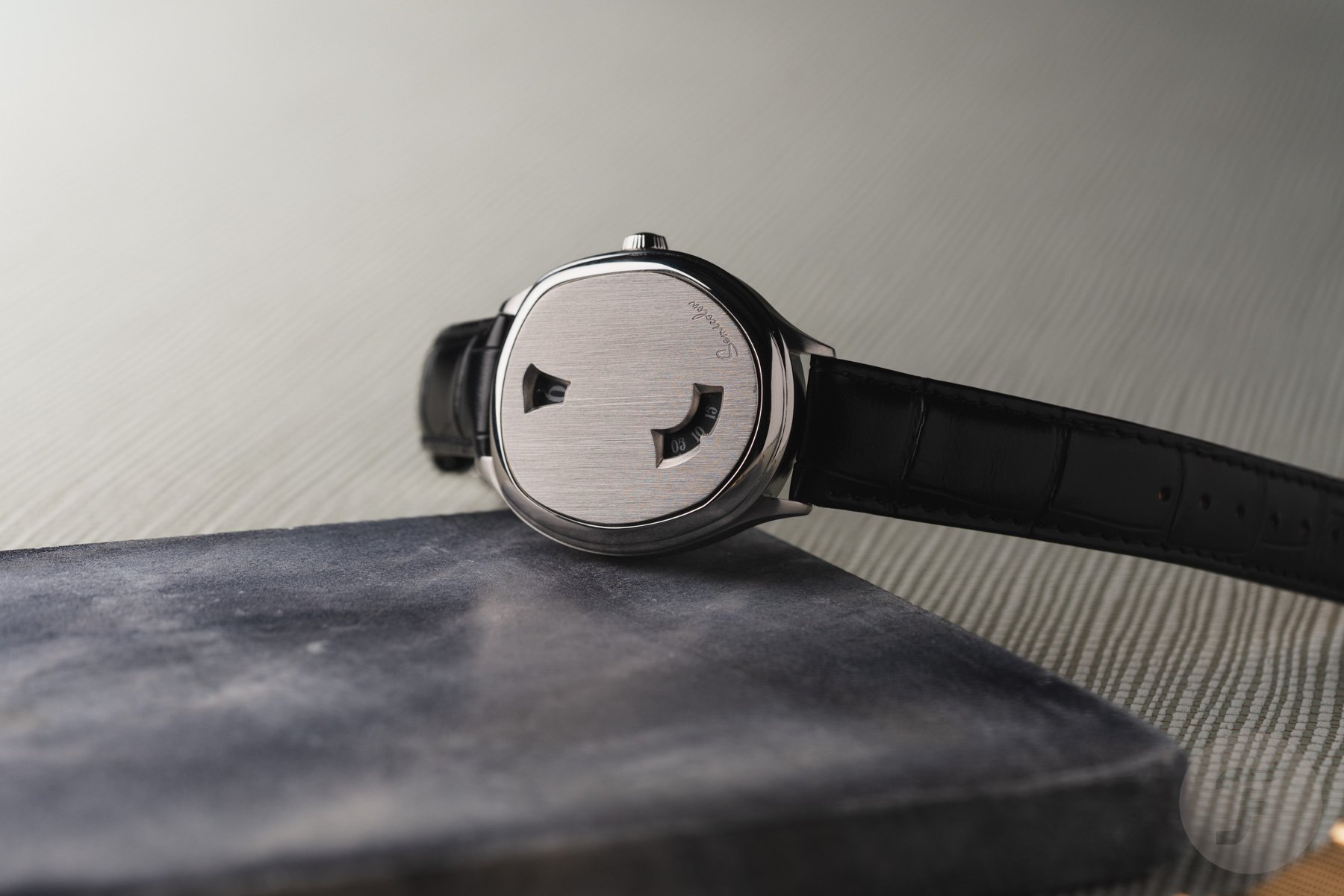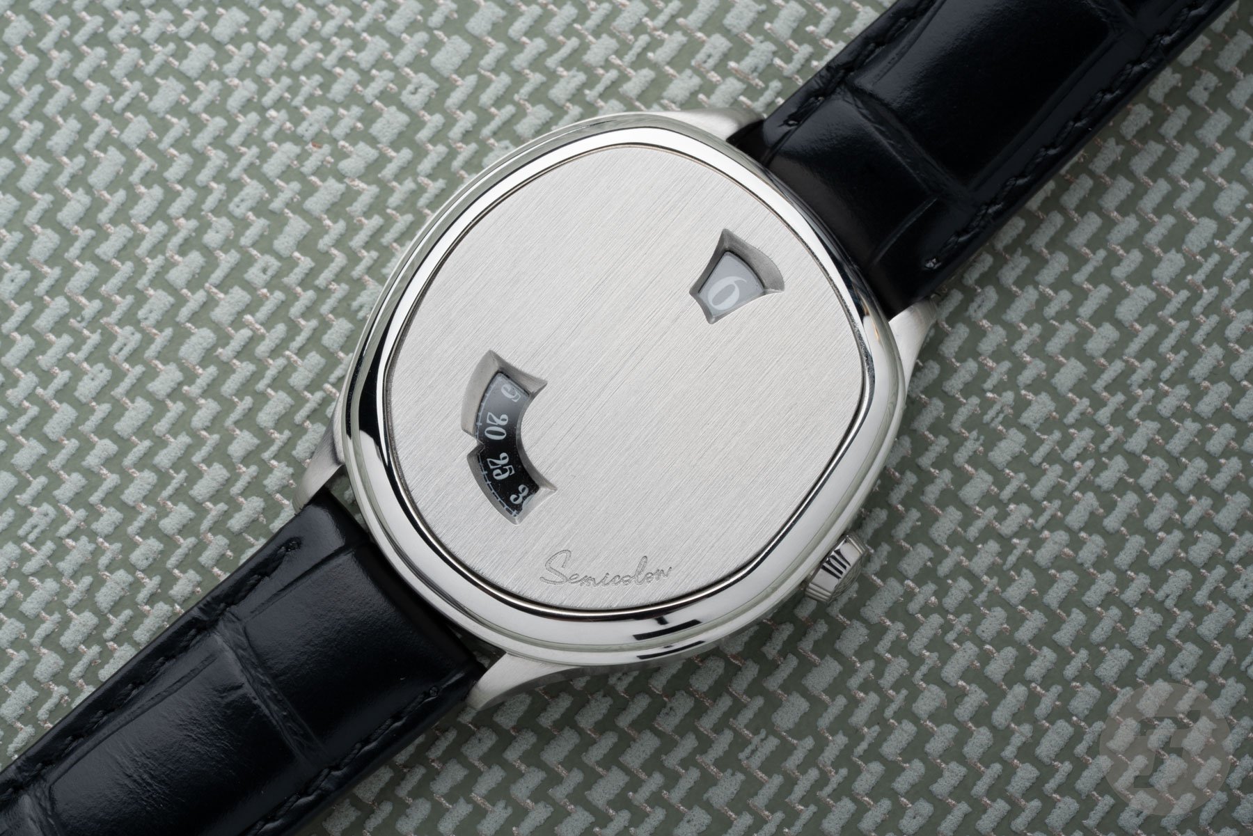 The case features brushed sides, a polished stepped bezel, and a brushed face with two apertures and the brand’s logo. The upper of the two apertures displays the hours, while the lower, larger aperture displays the minutes. This opening displays a total of 20 minutes for visual context. While it is not necessary, it is also comfortable to refer to and opens up the face a bit more. And if you look from a little further away, the two apertures reference the brand’s namesake punctuation mark, the semicolon.
