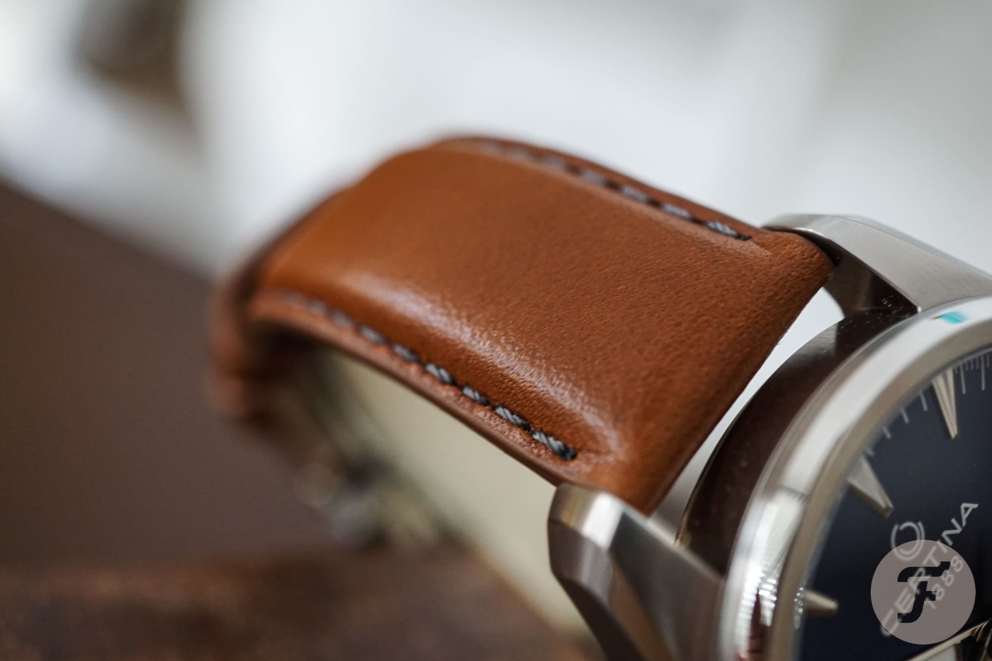 As I wrote above, the DS Action Day-Date Powermatic 80 comes in three dial colors and two straps (black or brown) and two bracelets (steel or two-tone). The blue dial version comes on a brown calf leather cognac strap. I have to say the photos don’t do the strap justice. It appears to be darker than it is in the metal (or leather in this case), but this is a good thing. Eventually, the leather will darken anyways. The lug width is 20mm, so the strap is a standard 20/18 version with a steel deployant. It’s a double deployant or butterfly clasp with security push buttons. The strap is padded, which adds a bit of depth to the watch when on the wrist. There’s also grey side stitching and goes down on both sides of the strap.