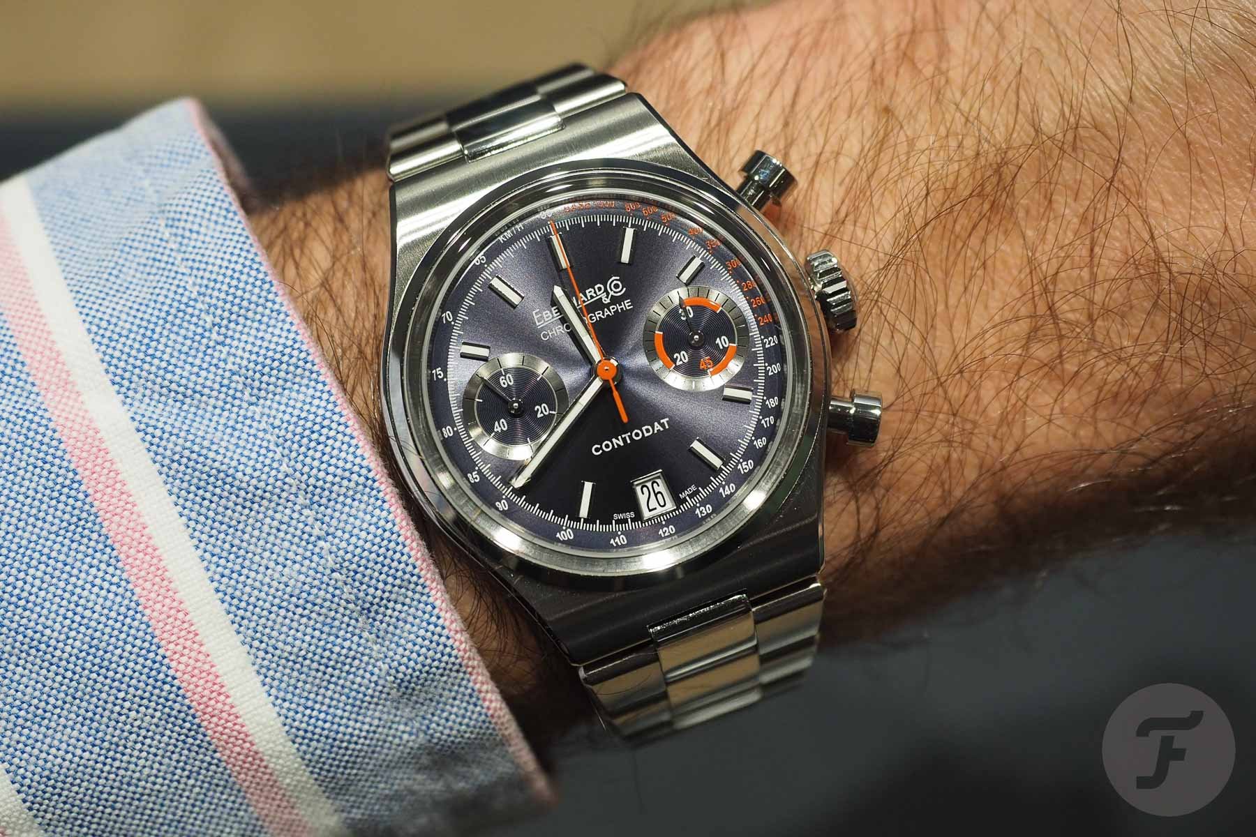 Eberhard chose a new name for its vintage-inspired collection. The new Contodat line consists of two basic models — a chronograph and a three-hand automatic — available in a range of colors. We’ll break down each model separately, but there are top-level similarities. The cases are stainless steel with integrated bracelets. Plus, each model uses a top-grade Sellita automatic caliber. Finally, and this is welcome news, both styles have a 100m depth rating and offer screw-down crowns.